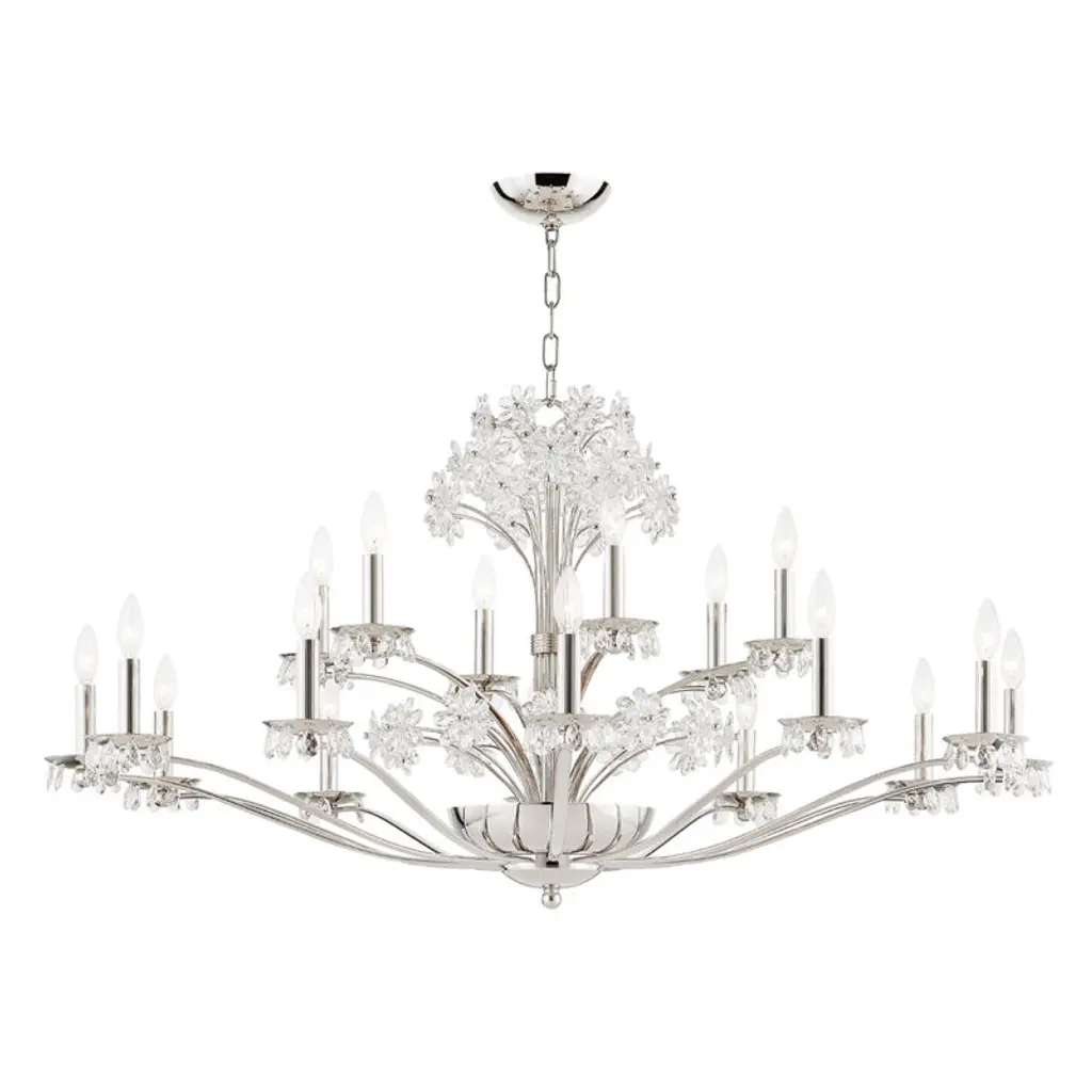 Accentuate your interiors with the elegance of bygone days using the Beaumont Chandelier by Hudson Valley Lighting. A modern fixture that starts by dropping a single chain from a rounded canopy, it sends curving metal arms out from the base of a central hub, each one terminating in a damp-listed candelabra-style lamp with cut-glass accents dangling from each bobeche. A sheaf of slim metal stems travels upward from the hub, blossoming into a series of cut glass petals that brilliantly reflect the open lamping below them.
