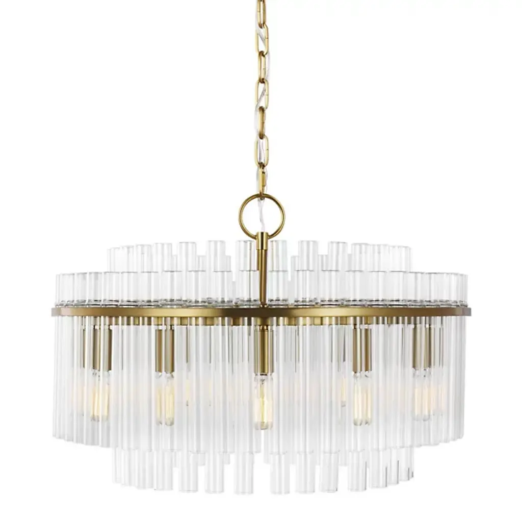 Refined drama. The Beckett Chandelier by Visual Comfort Studio, formerly known as Chapman & Myers, showcases an elevated glamor that instantly enhances the look of a room. Suspended by a thin chain ending in a slender loop, this chandelier includes an array of clear glass flutes held vertically along a circular metal frame. A set of incandescent bulbs rest within the layered glass flutes, casting an even layer of light throughout its surrounding as it refracts through the glass.