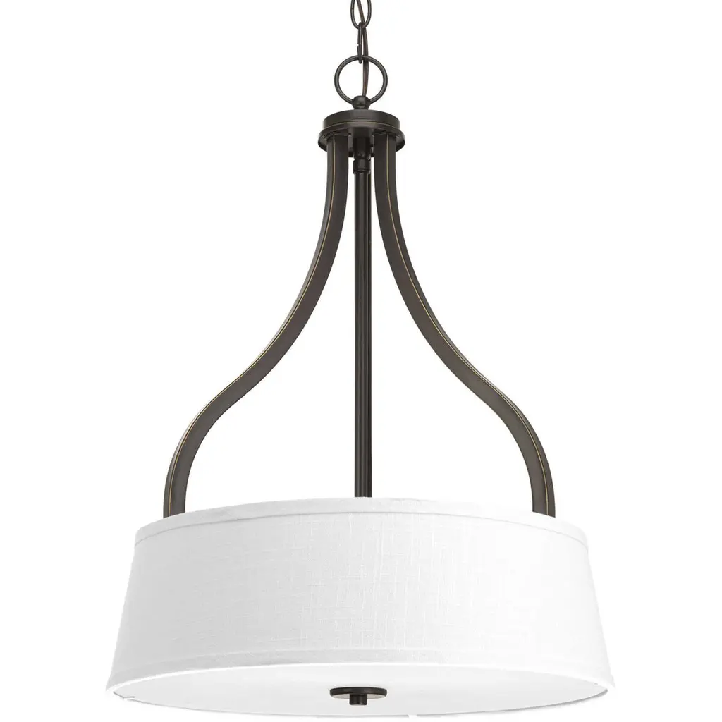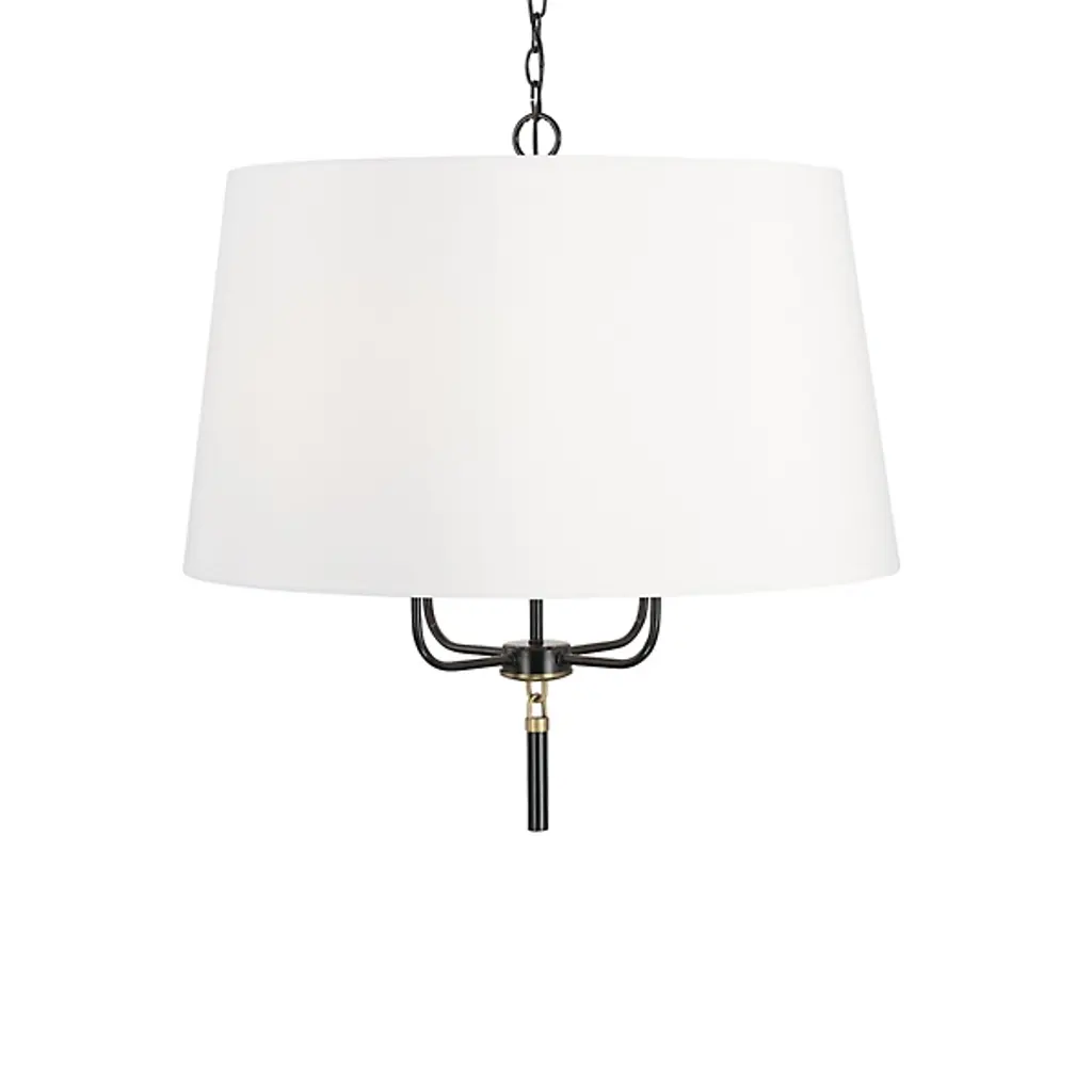The Beckham Chandelier from Capital Lighting adds a stylish, transitional presence ideal for a wide range of inside décor styles. Suspended from above by a chain and central stem arrangement, it uses a rounded lower hub to secure a set of slender, upward-curving arms to secure four 60 watt candelabra-style lamps beneath a wide, white fabric shade. This blocks the bright glare from the side, transforming it into a pleasing ambiance accented by a central wash of downlight that descends through the shade’s open base.