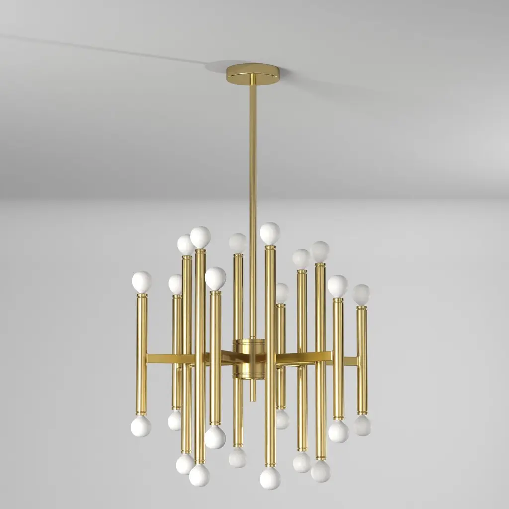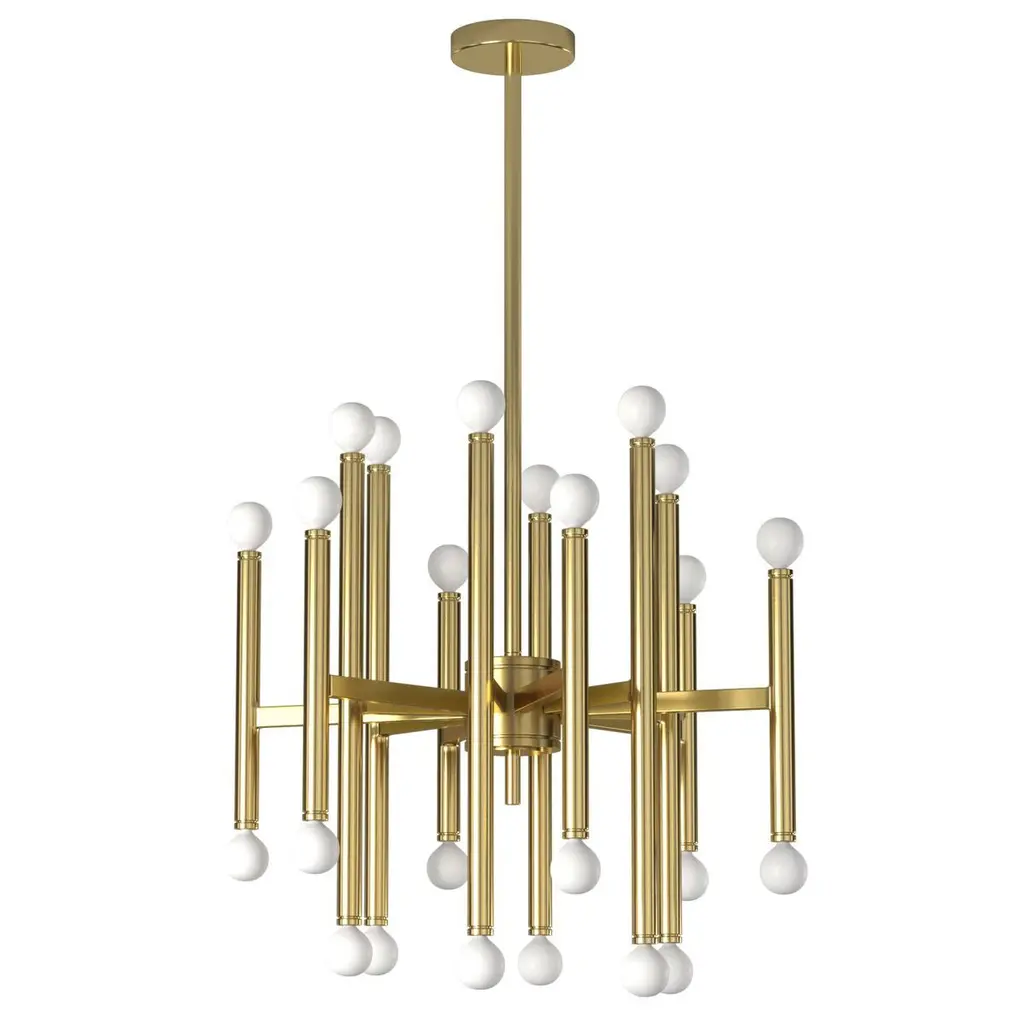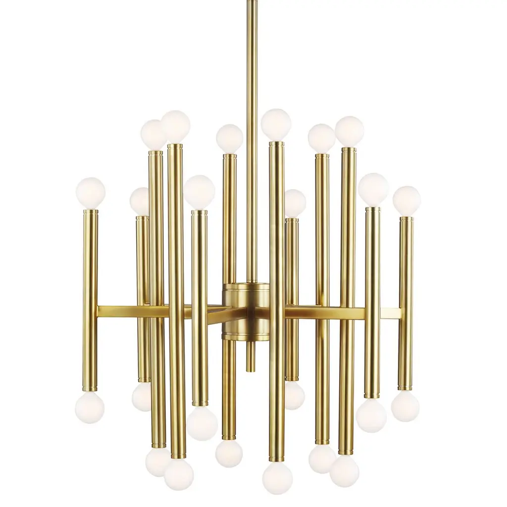 Featuring a dozen vertical arms with bulbs on top and bottom, this chandelier will brighten any space. The lustrous brass finish adds to the contemporary glamour.Thomas O’Brien is a master at bridging traditional and modern, whether in his acclaimed interiors, his signature home furnishings, or his New York store, Aero. His designs for Generation Lighting make it easy for you to incorporate his distinctive aesthetic into your home.