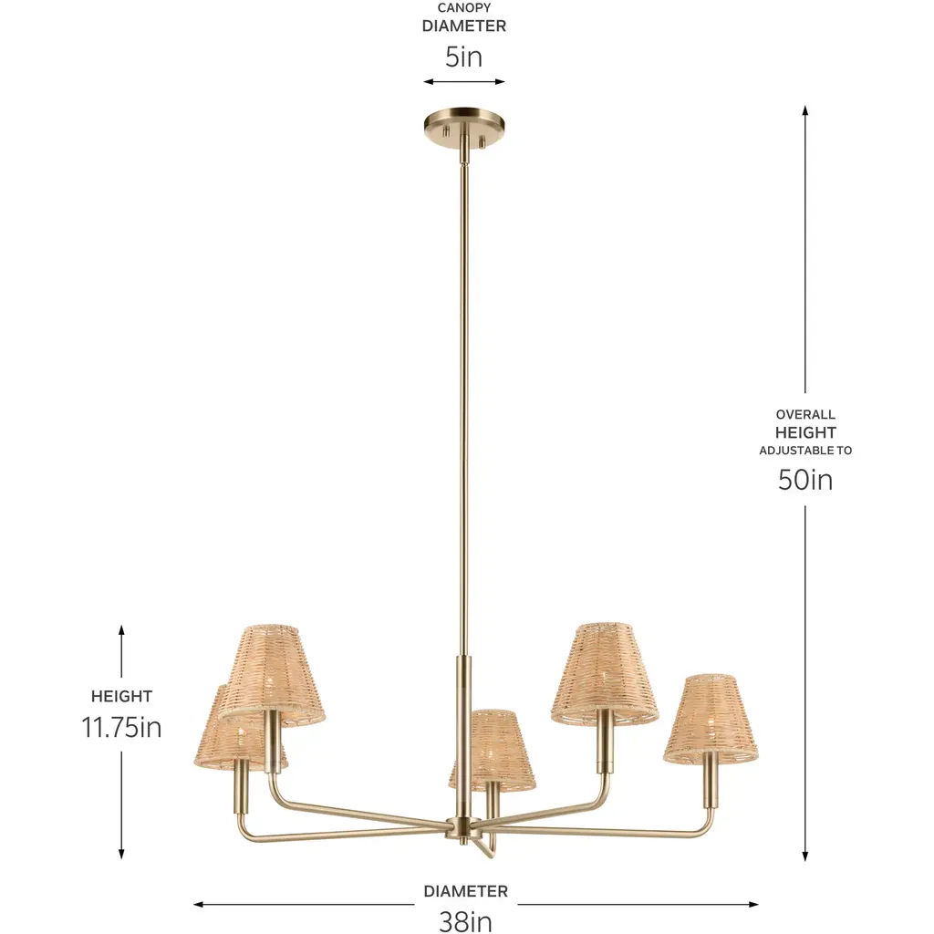 Create an organic earthy vibe in your space with the Bekah chandelier. Artisans crafted this fixture using handwoven techniques and natural materials, making each one unique. Each rattan shade filters the light for a soft, warm glow. Its stem and canopy complete the look in our signature Champagne Bronze finish.