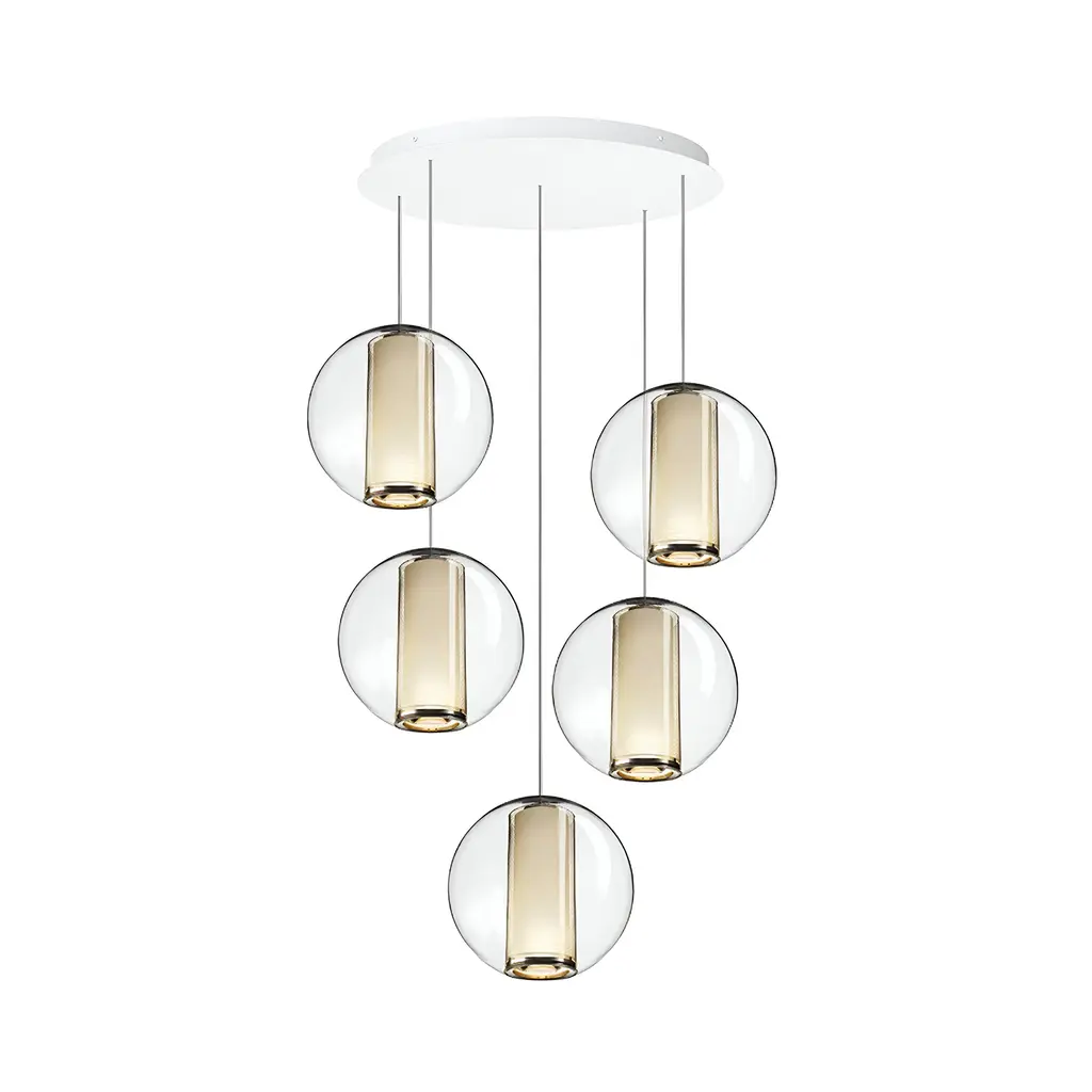 Bel Occhio's unique combination of clear globe fixture that surrounds an opaque inner column beautifully transforms as a striking chandelier in configurations of 3 and 5 individual pendants. A study in weightlessness and transparency, designer Pablo Pardo's fixture is available with the choice of an orange or white columnar diffuser. While the cylinder provides focused illumination, its transparent sphere spreads an all-over ambient glow to its surroundings.
