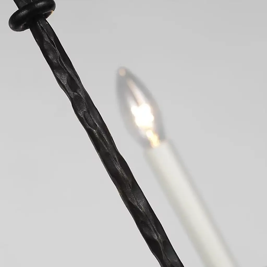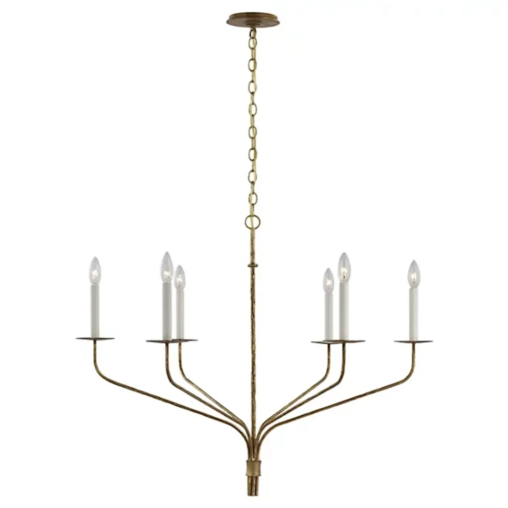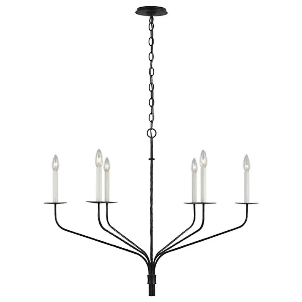 A finely-wrought mix of transitional rusticity, the Belfair Chandelier from Visual Comfort Signature, formerly known as Visual Comfort, keeps things simple and stripped down. An Ian K. Fowler design that descends from a low-profile ceiling mount along a fine chain and slender stem, it terminates in a series of thin, strong arms of aged iron that curve out and upward to extend candelabra lamps from slim disc bobeche mounts. The open lamping shines with ample authority, adding a hint of glow to the matte texture of its slim, open structure.
