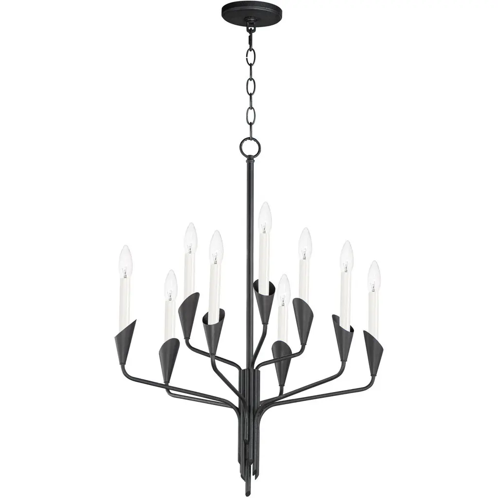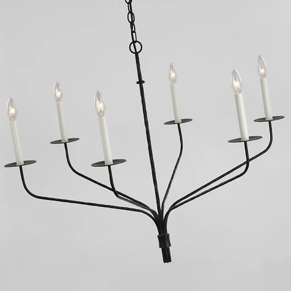 A finely-wrought mix of transitional rusticity, the Belfair Chandelier from Visual Comfort Signature, formerly known as Visual Comfort, keeps things simple and stripped down. An Ian K. Fowler design that descends from a low-profile ceiling mount along a fine chain and slender stem, it terminates in a series of thin, strong arms of aged iron that curve out and upward to extend candelabra lamps from slim disc bobeche mounts. The open lamping shines with ample authority, adding a hint of glow to the matte texture of its slim, open structure.