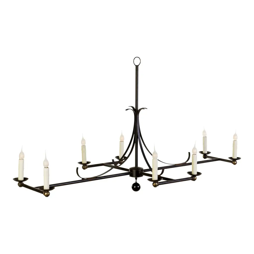 Simple and beautiful, the Belgrove chandelier features an elongated scroll design made from steel with small brass spheres under the bobeches and topped with beeswax candle covers that create an air of casual elegance. This chandelier is available in three finishes and each finish will produce a natural patina as it ages. These nature-inspired finishes protect the fixture but also create a more beautiful luster with time. This chandelier is made-to-order. Please select your finish before adding to cart.