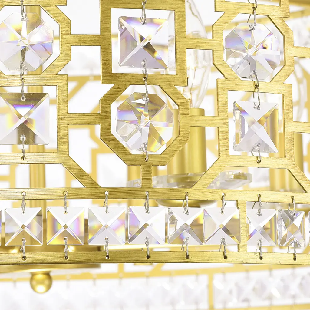 Elevate your interior with the stunning brilliance of the Belinda 6-Light 23-inch Chandelier. Featuring a laser-cut metal drum shade in a luxurious champagne finish and adorned with clear crystal prisms, this statement piece delivers dazzling elegance. Perfect for upscale dining rooms or glamorous bedrooms, this chandelier conceals six candelabra bulbs behind a geometric frame, casting a glittering glow that instantly enhances your decor. The adjustable hanging height ensures a tailored fit for your space. Finish: Champagne Diameter: 23" Light Source: 6 x E12 Bulbs (LED Compatible) Material: Metal and Crystal Style: Glam / Transitional Hanging Height: Adjustable