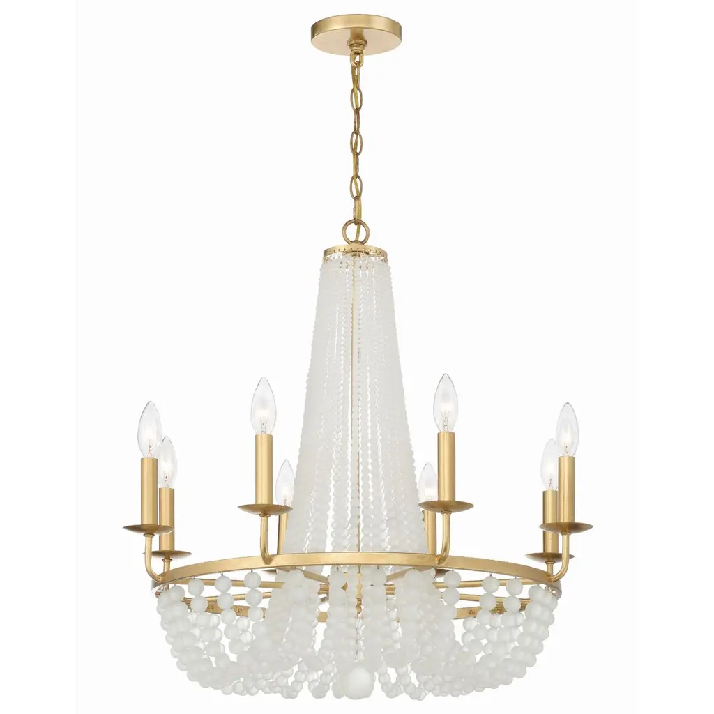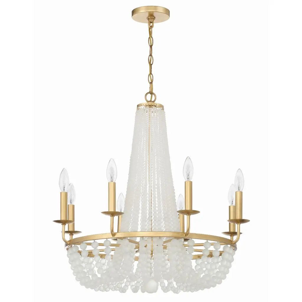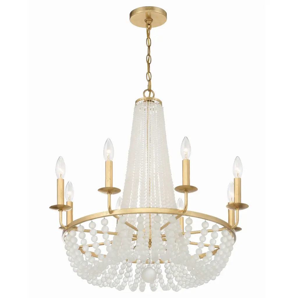 Add a touch of modern style to your décor with the frosted glass bead chandelier. The metal frame features glass beads sweeping downward and inward, connecting a larger hanging glass ball. This elegant contrast combined with frosted white glass adds a bold look to your indoor living areas.