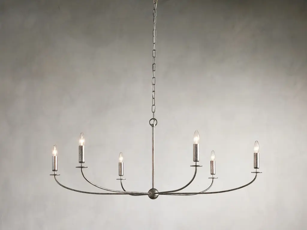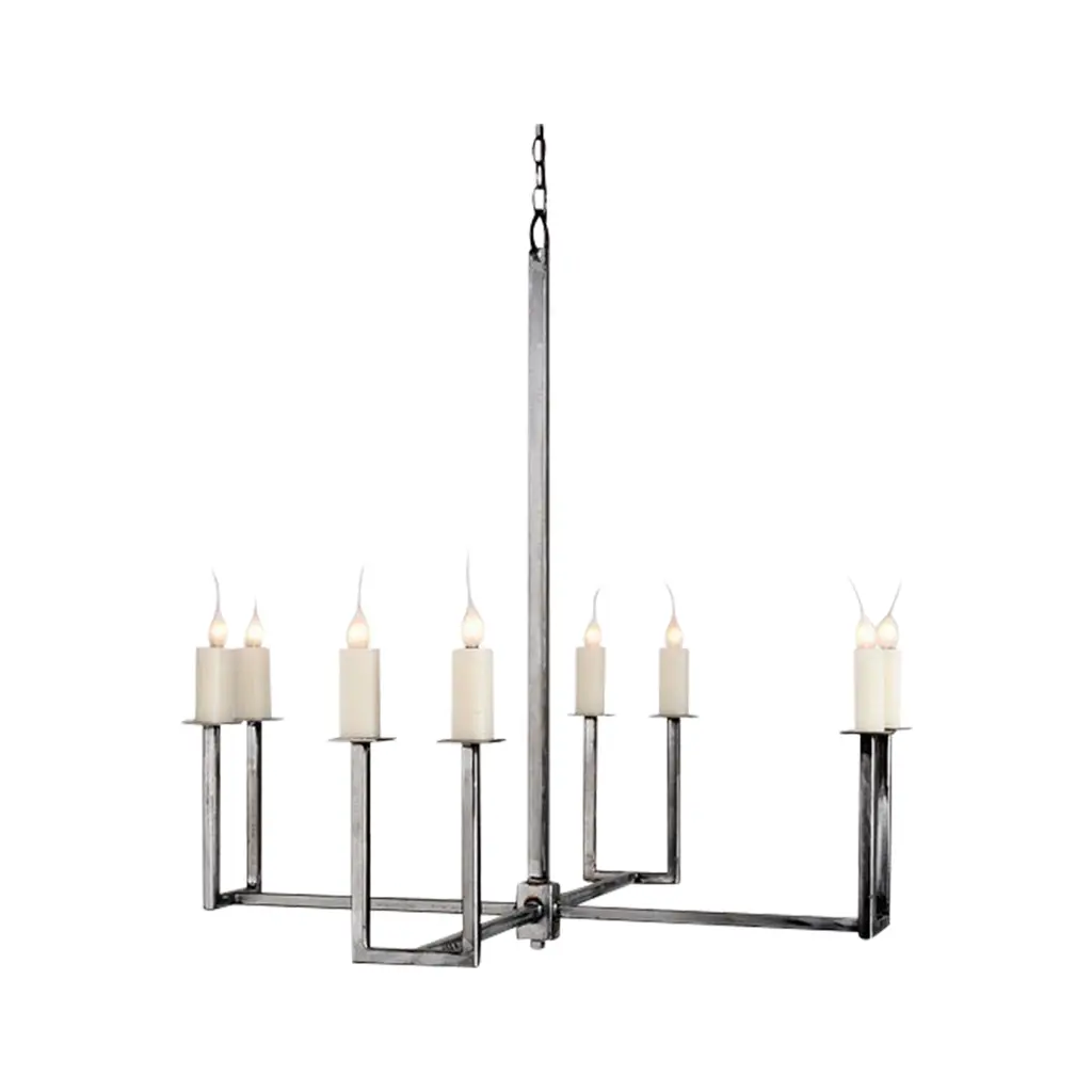 The Bellafonte chandelier features an eight-light "u" shaped design that lends itself to a more contemporary tone. Charming geometric shaped arms and beeswax candle covers give character to any space and is ideal for lower ceilings. This chandelier is available in three finishes and each finish will produce a natural patina as it ages. These nature-inspired finishes protect the fixture but also create a more beautiful luster with time. This chandelier is made-to-order. Please select your finish before adding to cart.