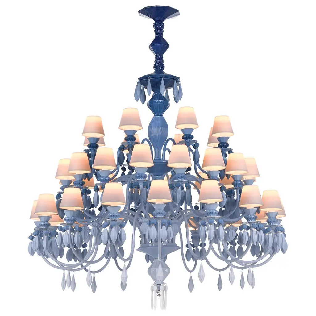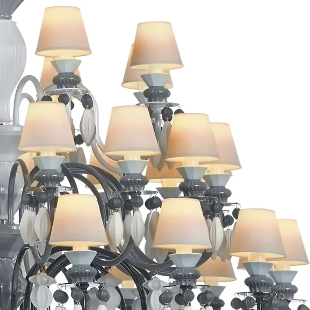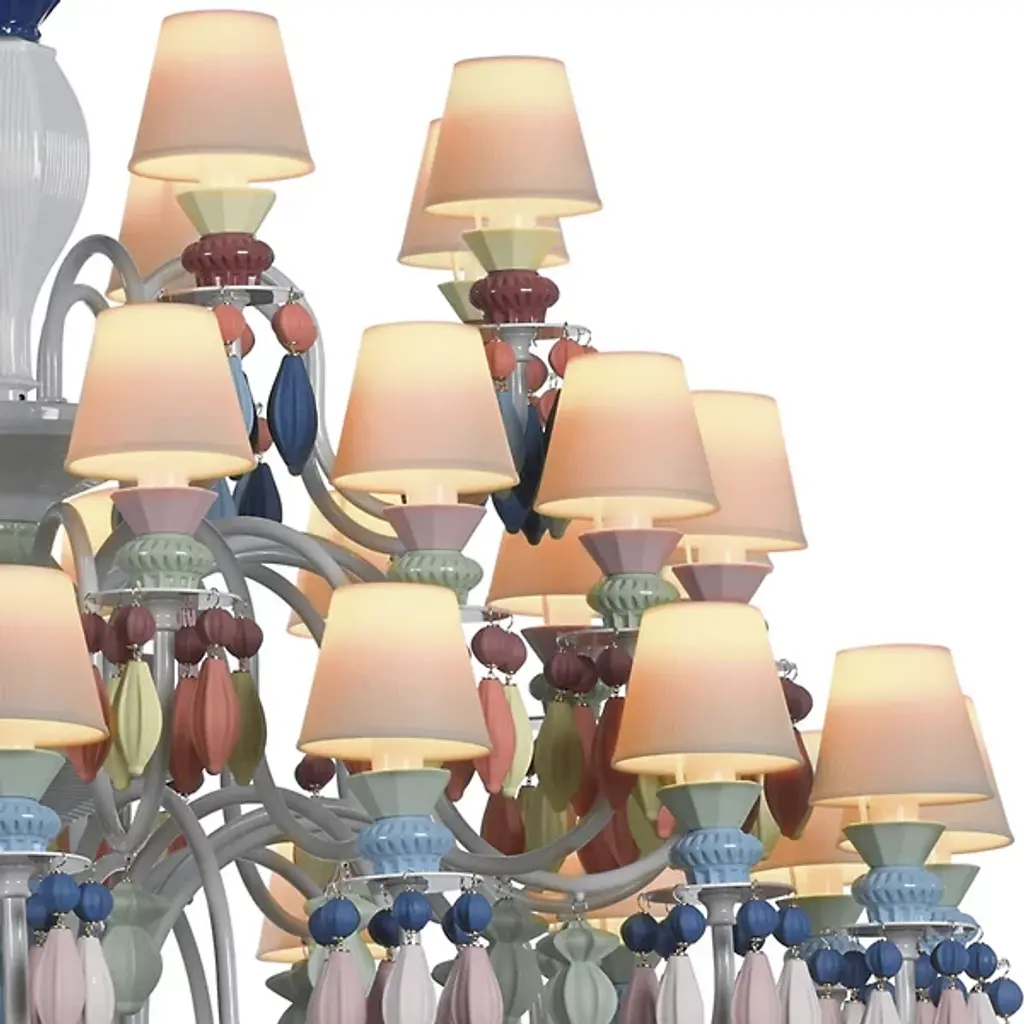 The Belle de Nuit 40-Light Chandelier by Lladro updates and adds an elegant twist to the classic crystal chandelier. Inspired by the variety of plants whose petals reflect the moonlight, magically appearing to glow in the dark, this chandelier displays a beautifully handcrafted collection of engraved porcelain lampshades that come to life when illuminated from within. A lovely finish dresses up this statement-worthy display, and porcelain accents and a decorative stem elevate the look of this design.