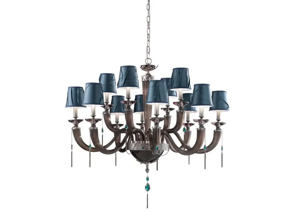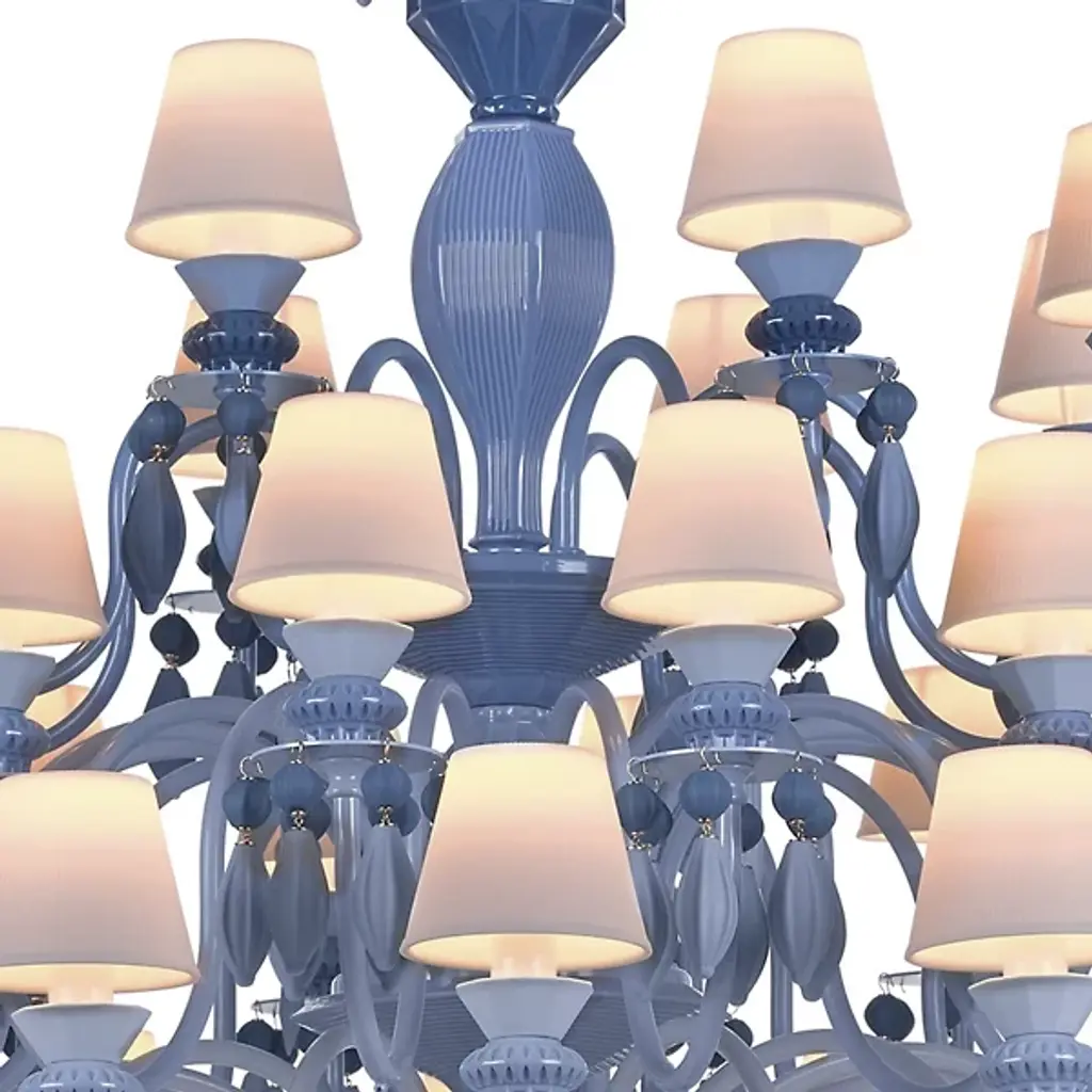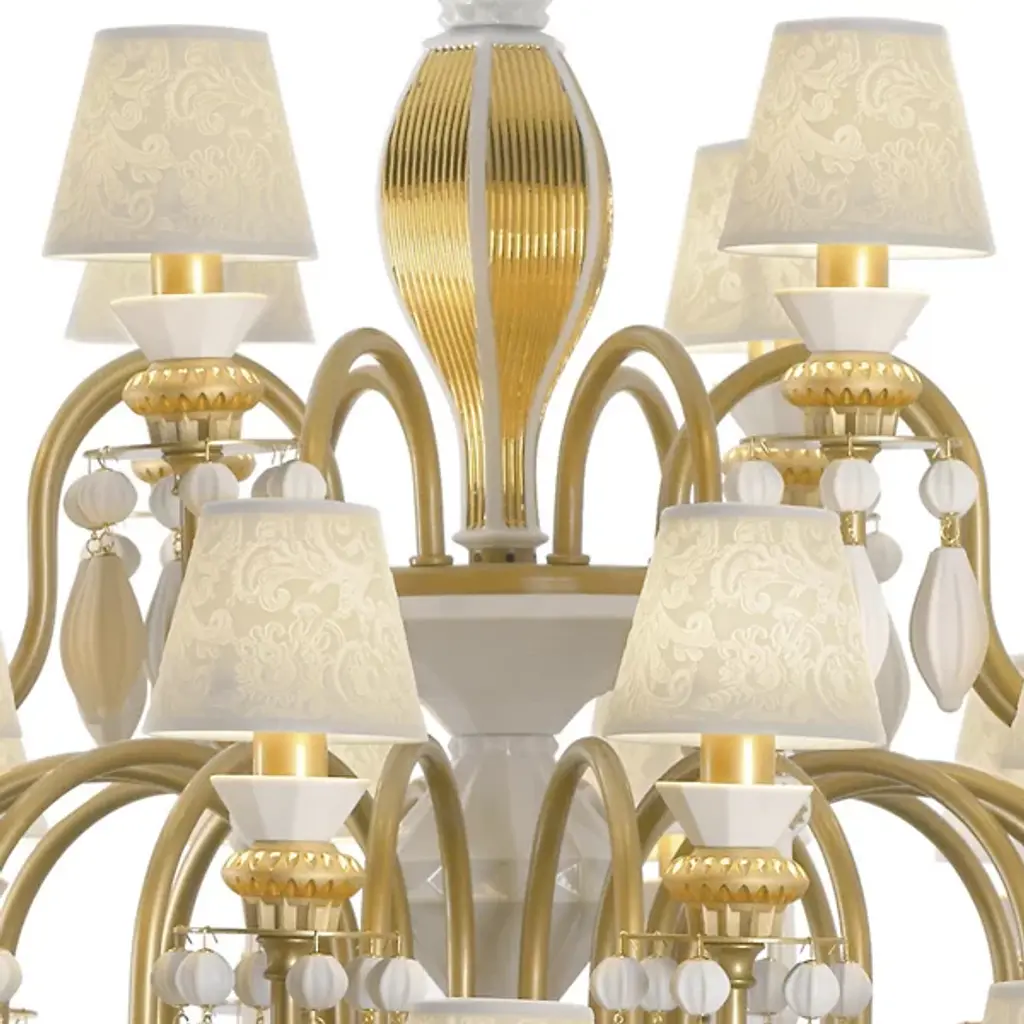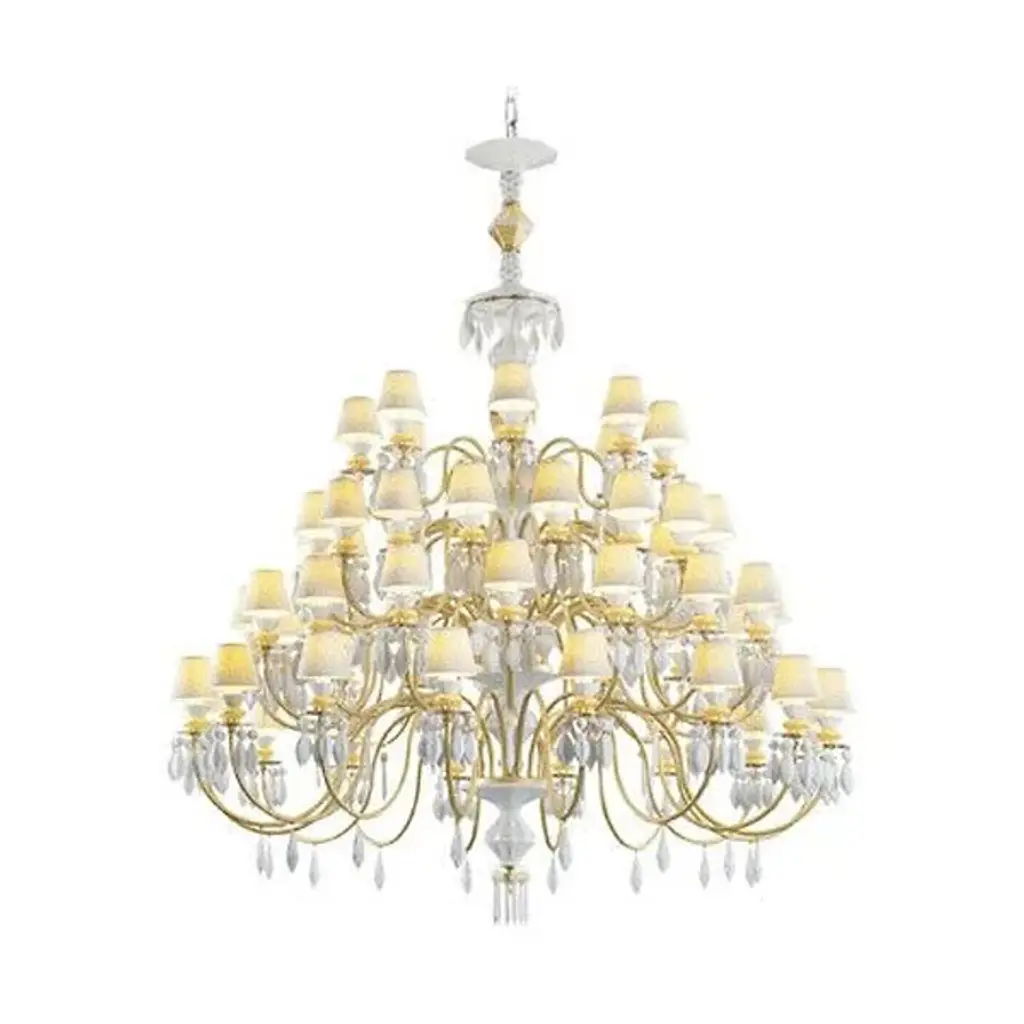 The Belle de Nuit 40-Light Chandelier by Lladro updates and adds an elegant twist to the classic crystal chandelier. Inspired by the variety of plants whose petals reflect the moonlight, magically appearing to glow in the dark, this chandelier displays a beautifully handcrafted collection of engraved porcelain lampshades that come to life when illuminated from within. A lovely finish dresses up this statement-worthy display, and porcelain accents and a decorative stem elevate the look of this design.