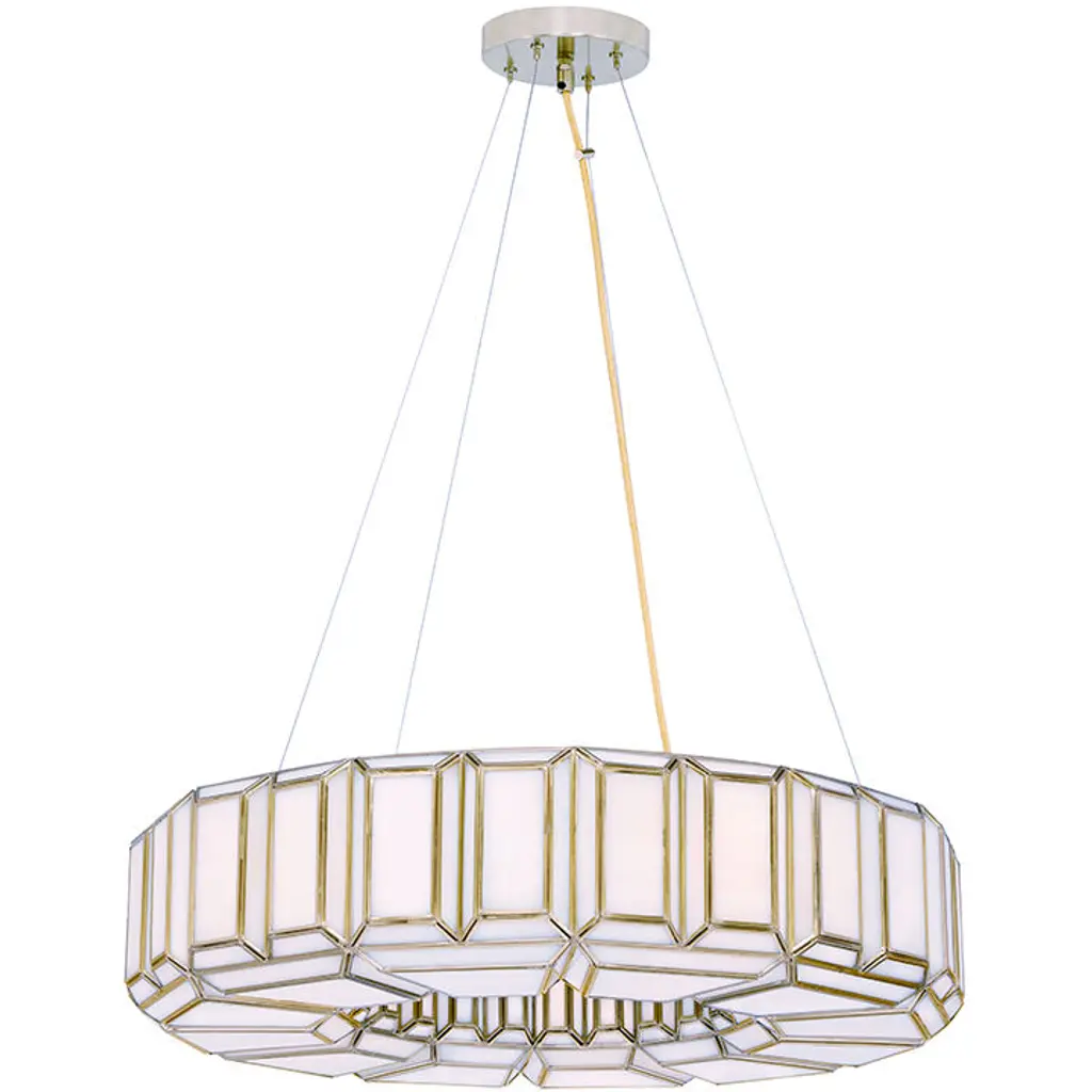 Hand cut emerald stained glass pieces deliver unique flashes of light and reflection via the many individual cuts and surfaces. A rare few are colorless cloudy white and that unusual stone becomes the backbone of this family of brass-wrapped white glass. The resulting ring of white will answer the needs of contemporary and traditional homes, alike.
