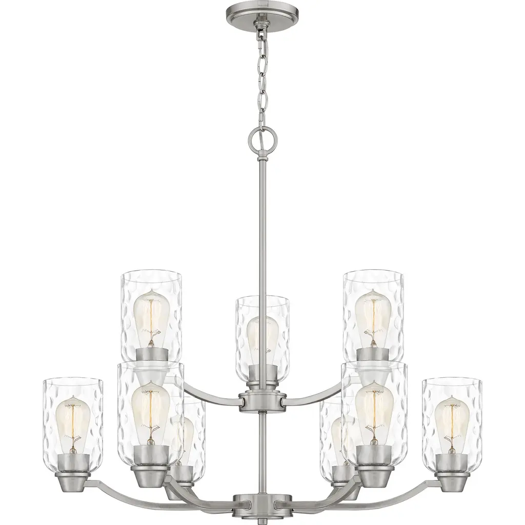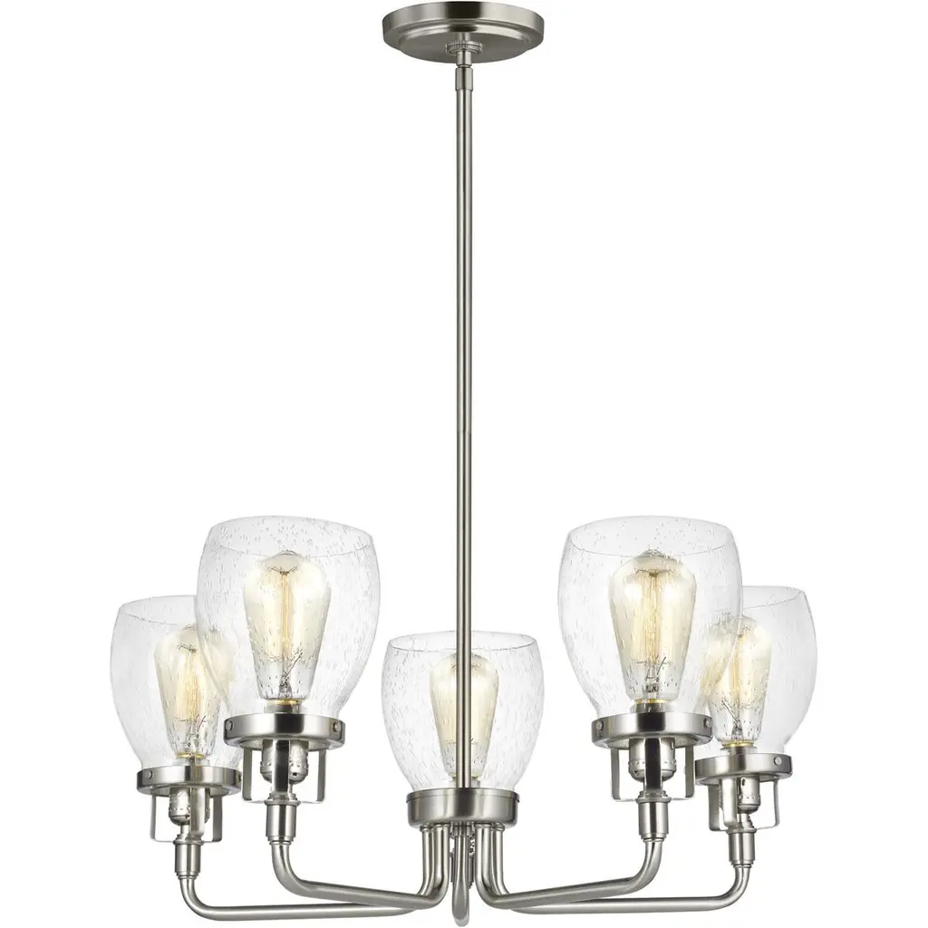 The Belton five light single tier chandelier in brushed nickel is the perfect way to achieve your desired fashion or functional needs in your home. Influenced by the vintage industrial designs of early 20th Century America, the transitional Belton lighting collection has seeded glass shades and Midnight Black finish, adding a layer of retro design to the warm look.