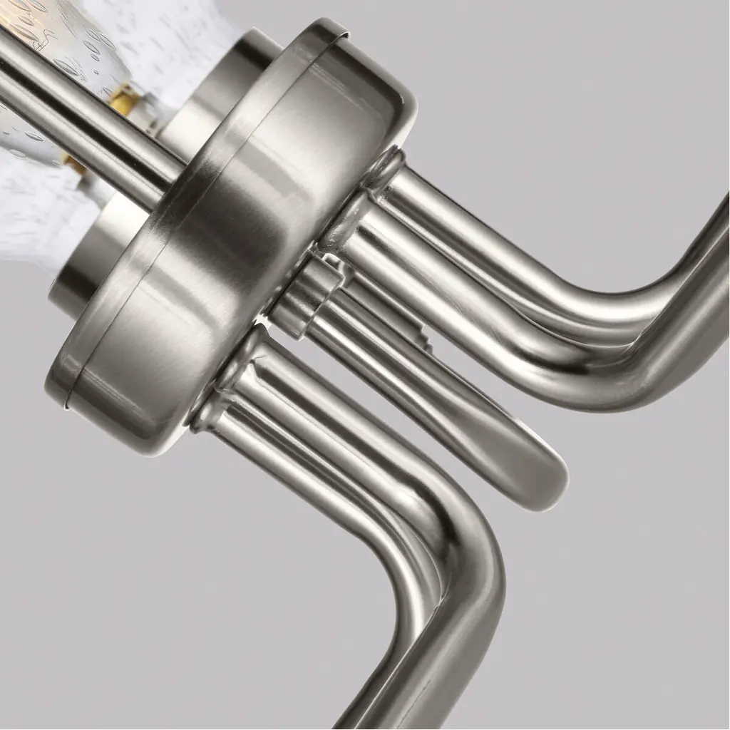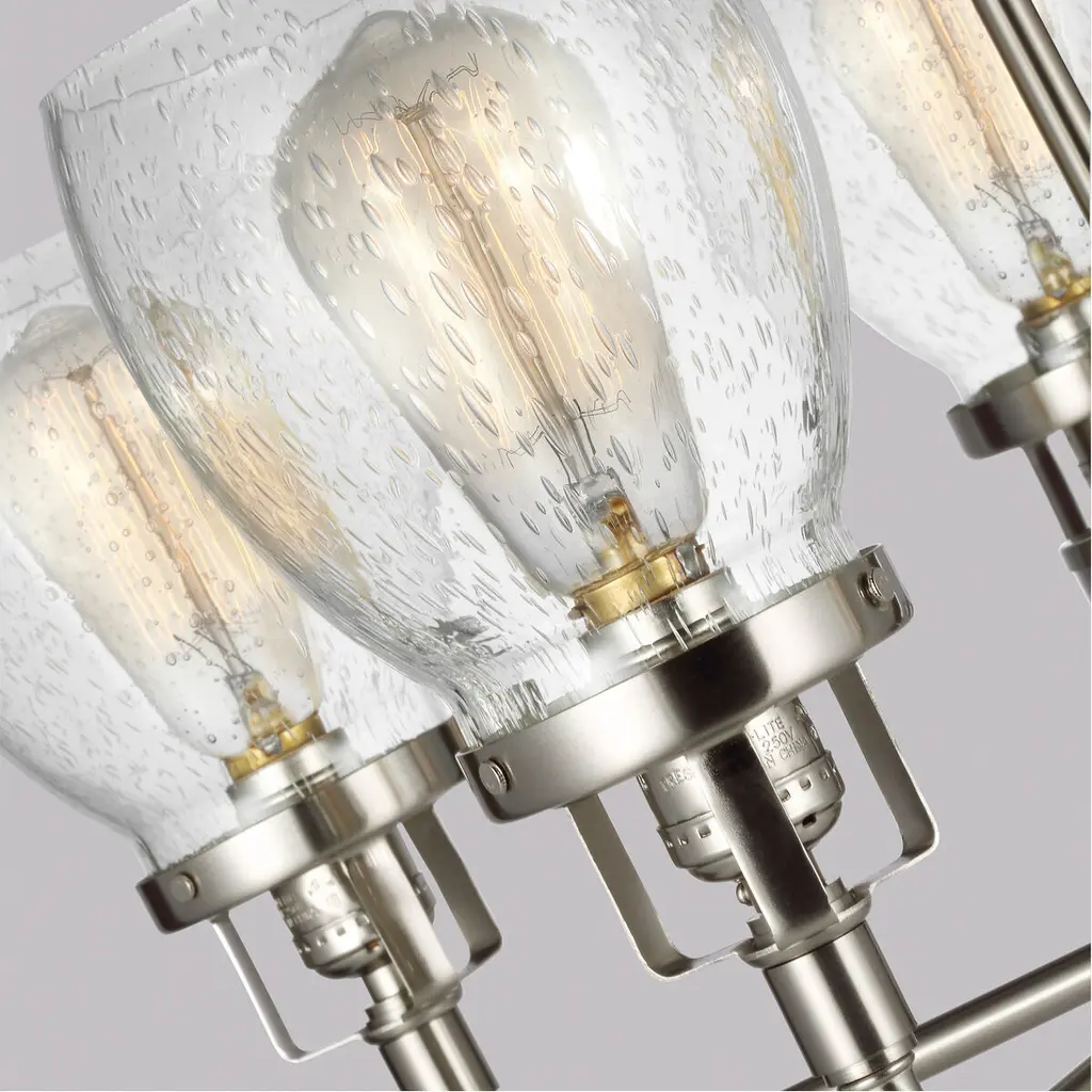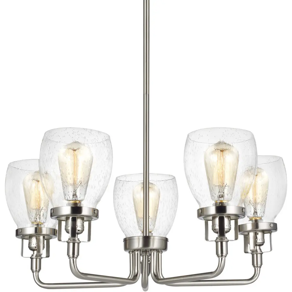 The Belton five light single tier chandelier in brushed nickel is the perfect way to achieve your desired fashion or functional needs in your home. Influenced by the vintage industrial designs of early 20th Century America, the transitional Belton lighting collection has seeded glass shades and Midnight Black finish, adding a layer of retro design to the warm look.