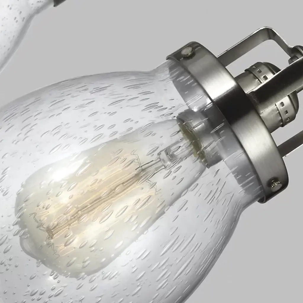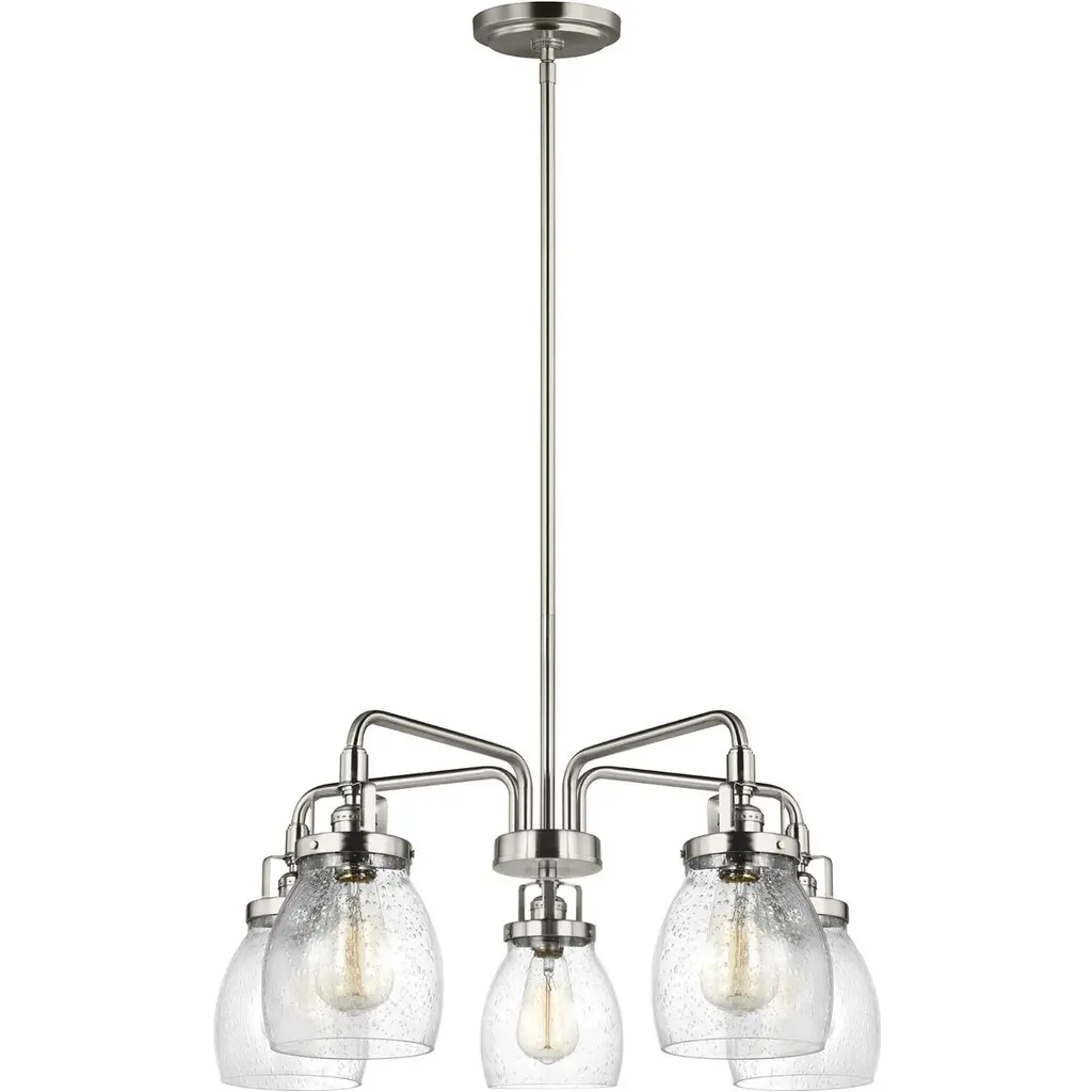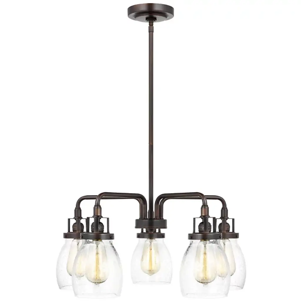 Brimming with personality, the Belton Chandelier by Generation Lighting, formerly known as Sea Gull Lighting, brings an industrial edge to your living space. Its eye-catching, pipe-inspired body supports a series of Seeded glass shades via decorative holders. Each shade diffuses light from a vintage tungsten Edison bulb, providing a warm, shimmering ambiance to the surrounding space. A perfect rustic statement piece either over an entryway, living room, or kitchen table.