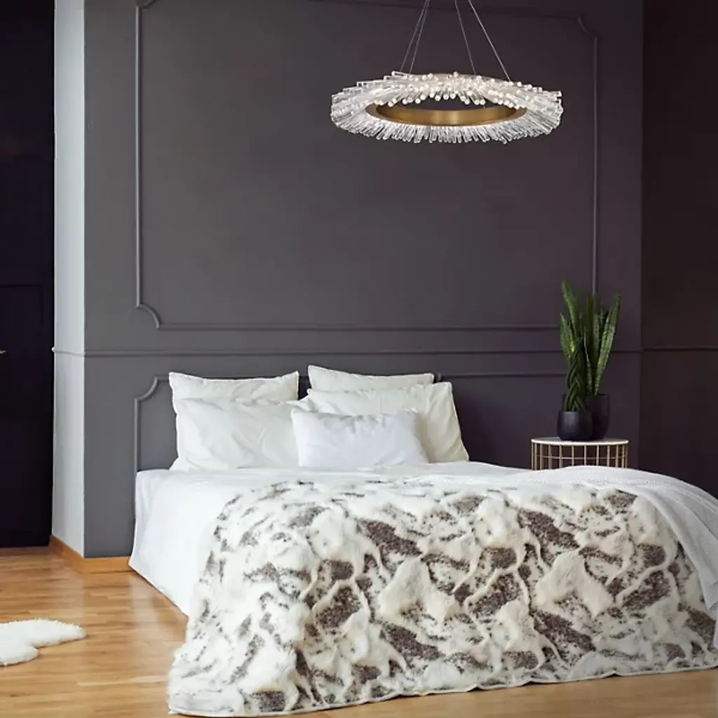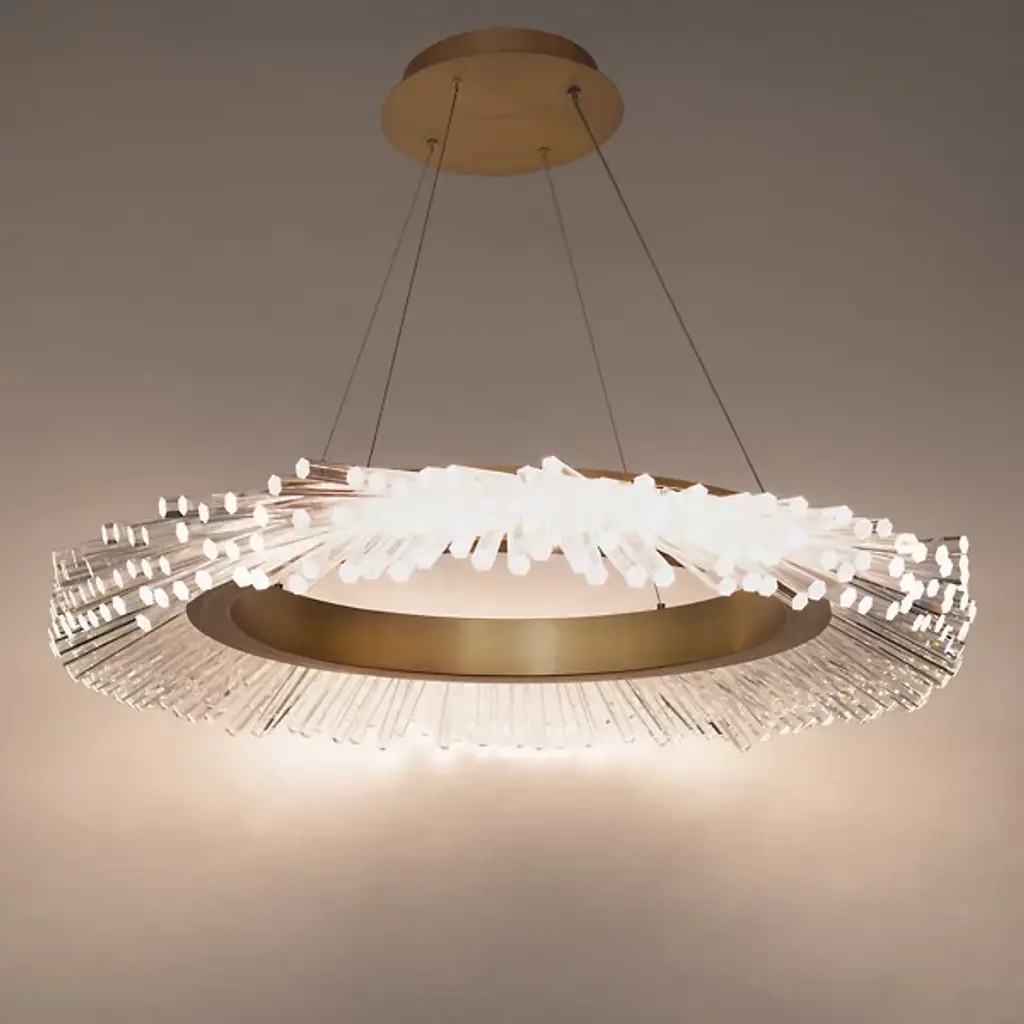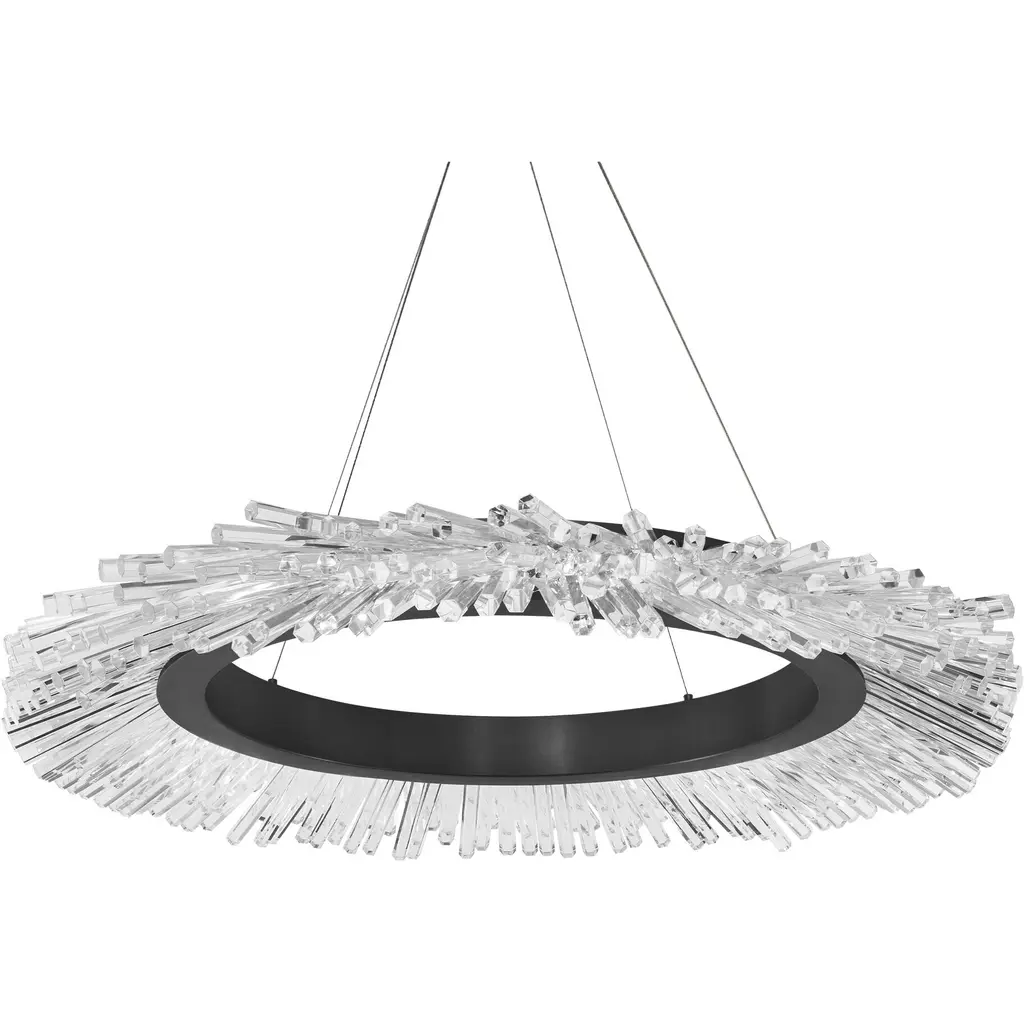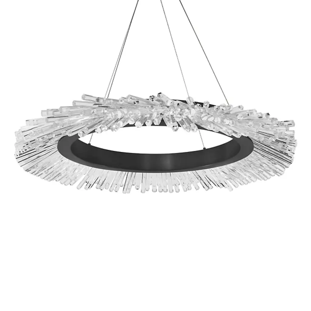 The Benediction LED Chandelier by Schonbek Beyond is a glamorous addition to spaces that features an array of crystal rods that playfully reflect and refract energy-efficient illumination throughout their forms. Creating a varied, textured landscape, these optic crystals are set around the edge of an openly formed aluminum halo and expand outward like stalactites found within a cavern. Suspended from a round canopy for an airy feel, this chandelier is a brilliant way to brighten up a room.