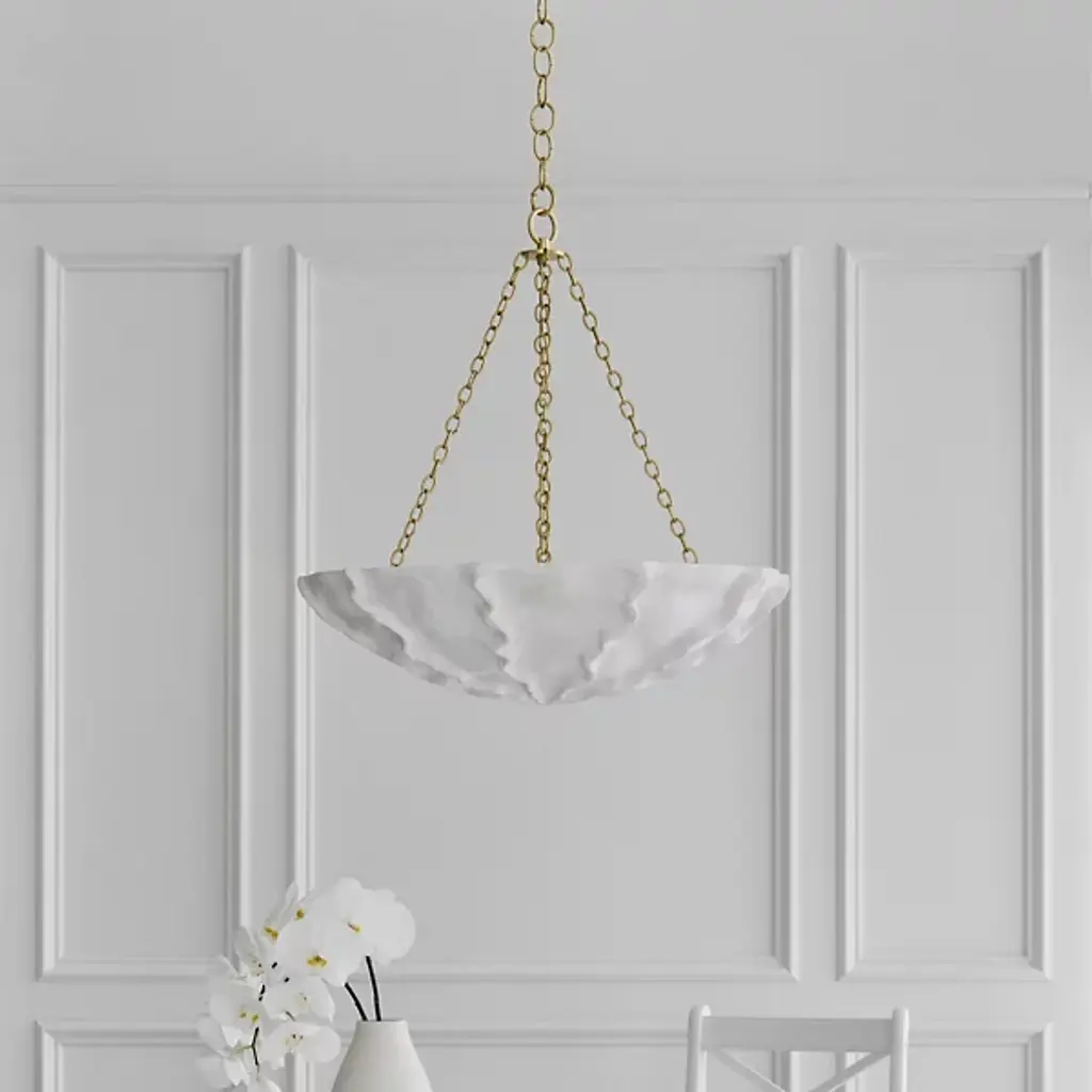 Beautiful and mysterious like the rugged yet pristine surface of the moon. Tie together the organic notes of your décor with the handcrafted design of the Benit Sculpted Chandelier from Visual Comfort Signature, formerly known as Visual Comfort, The chandelier gives the room a true focal point. Like fine jewelry, the chandelier streams down with an elegant chain-link suspension. A grand dome of polyresin follows below. Wavy contours and textural marks define the exterior of the dome. These features stand out in silhouette as bright light filters through them. The filtered light creates a glare-free, room-filling glow.
