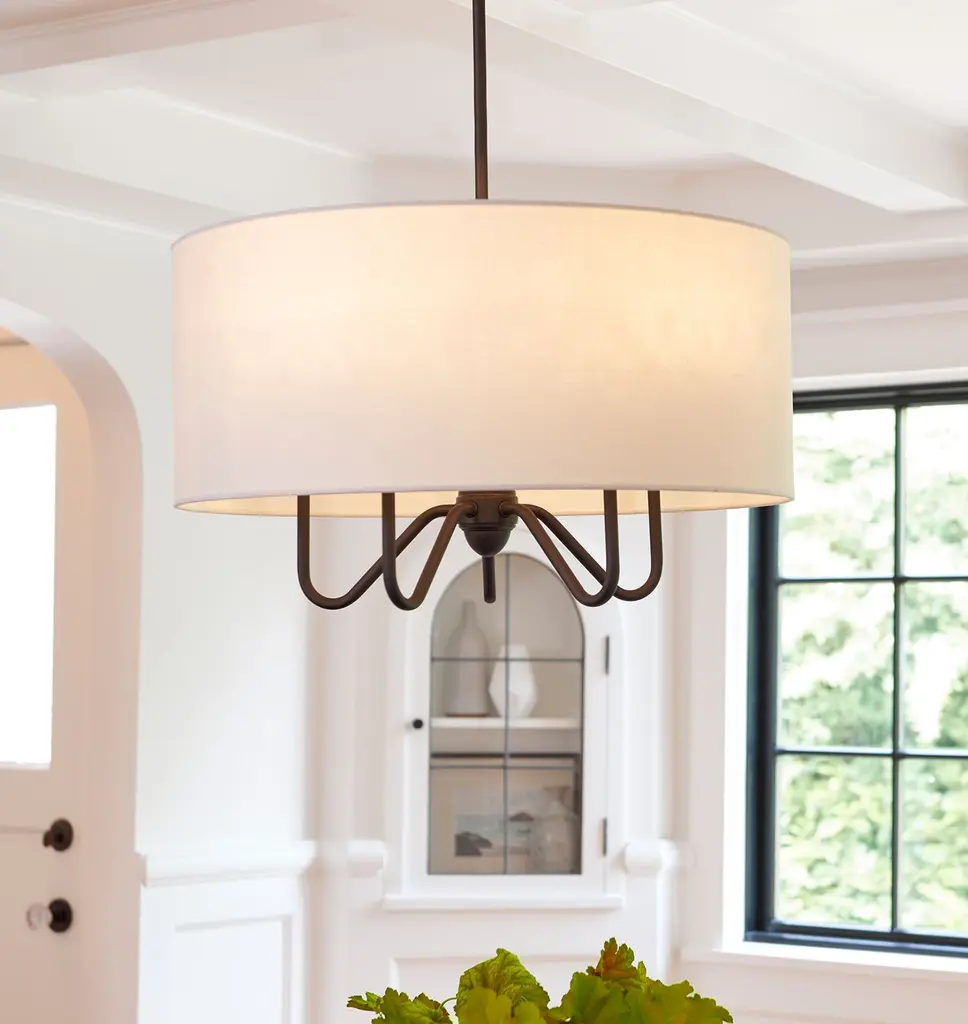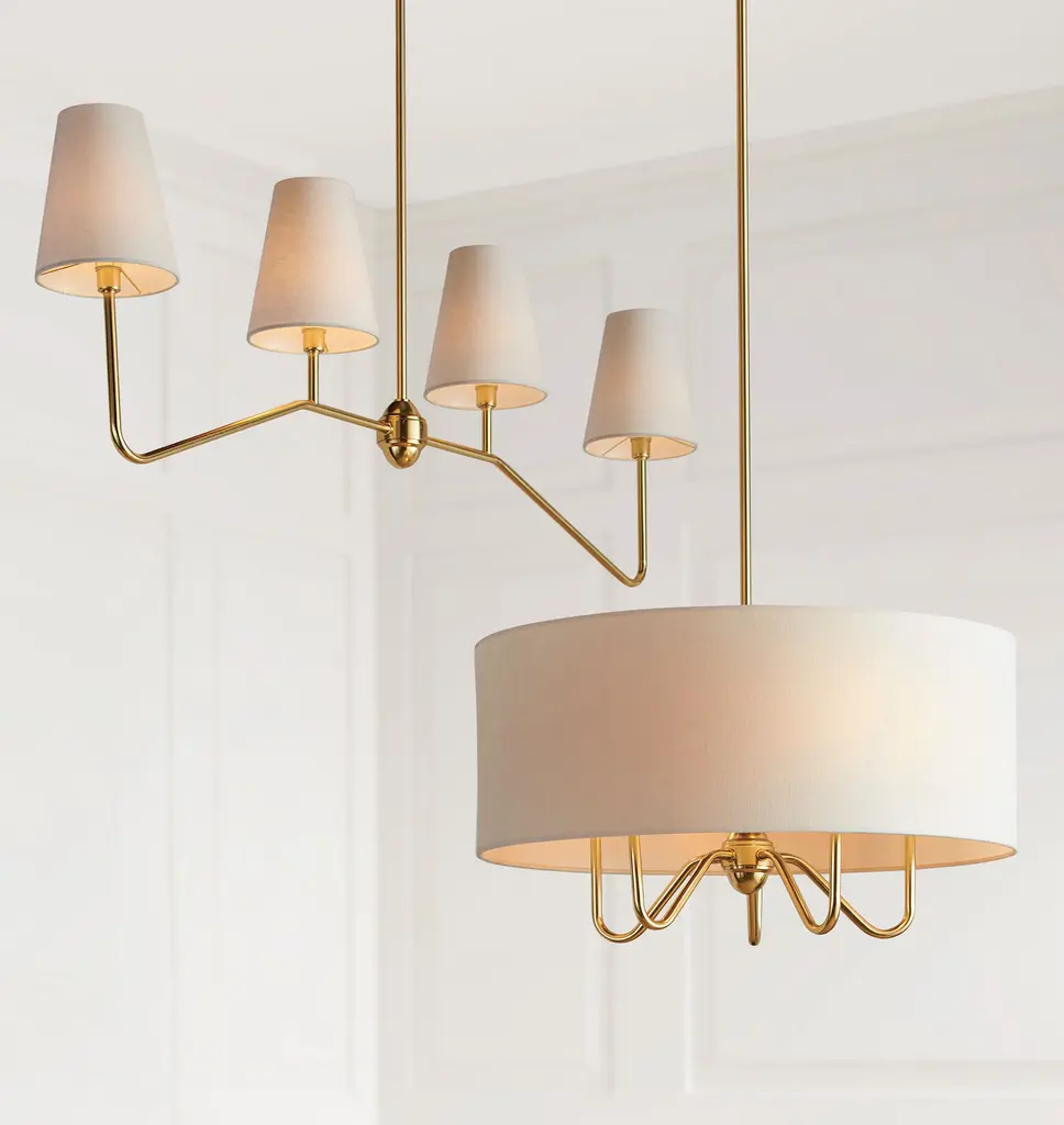 Designed in Portland, the Berkshire family takes an updated look at traditional Colonial style. Though it speaks the familiar Colonial design language, we've updated the vernacular by compressing the curves on its elegant candlestick arms and elongating its signature shades. Offering a contrasting look with finish and shade, this Rejuvenation exclusive design is available in multiple lengths and makes a statement in dining rooms, entryways, and living spaces. Product Specifications Fabric shade Oil-rubbed Bronze finish, steel fixture Aged Brass finish, brass fixture Hang straight ball joint accommodates sloped ceilings up to a 40 degree angle Clean with a soft dry cloth; avoid the use of harsh cleaners or abrasives, especially ammonia based cleaners Hardwired; professional installation recommended Suitable for indoor use (UL Rated Dry) Imported