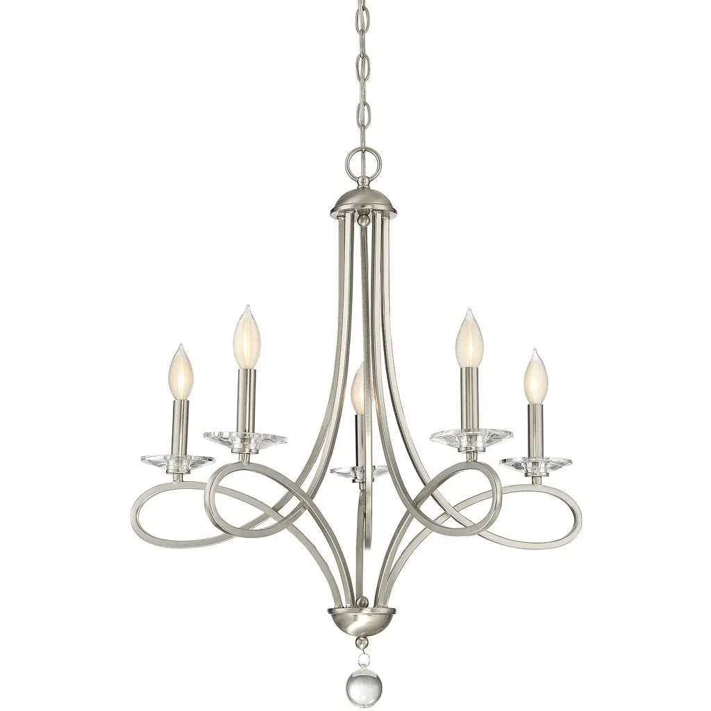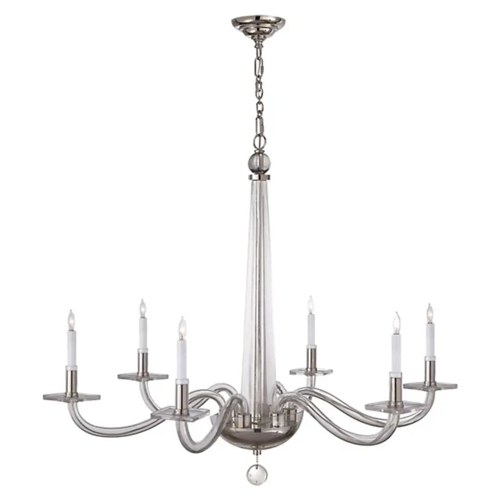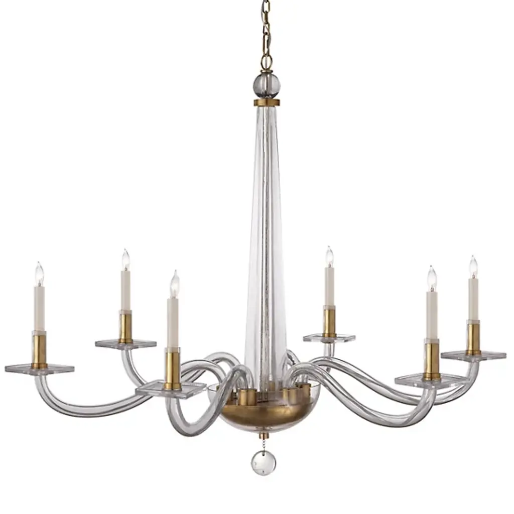 Refresh décor with the modern appeal of a Bernardo Large Chandelier by Visual Comfort Signature, formerly known as Visual Comfort, The tapered center, tubular arms, bottom bowl and square bobeches are exquisitely crafted of transparent glass for a lighting design that's clearly new and different. Metal mounting hardware and accents add a touch of gleam and interest to this ceiling fixture. An updated take on chandeliers, it looks stunning in contemporary living spaces, dining rooms and bedrooms.