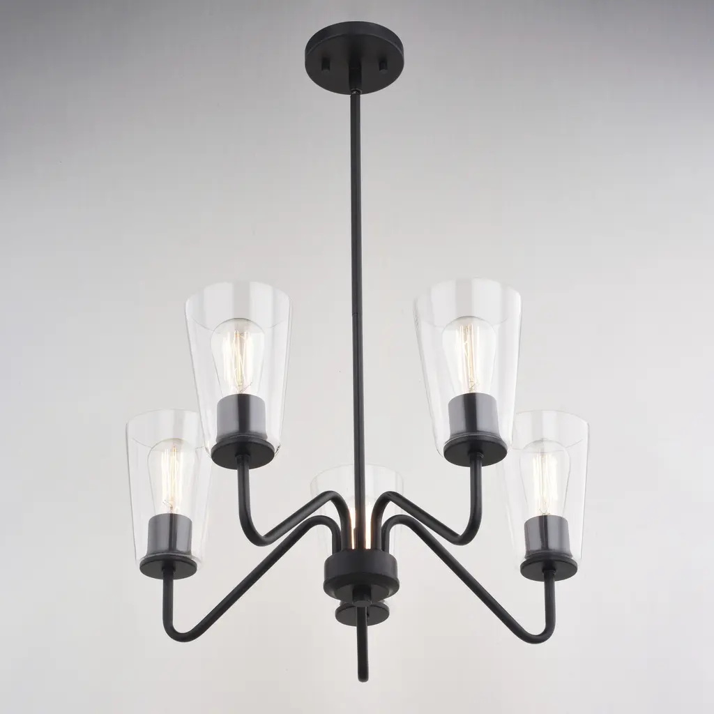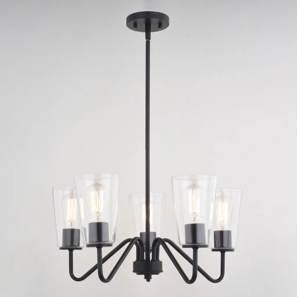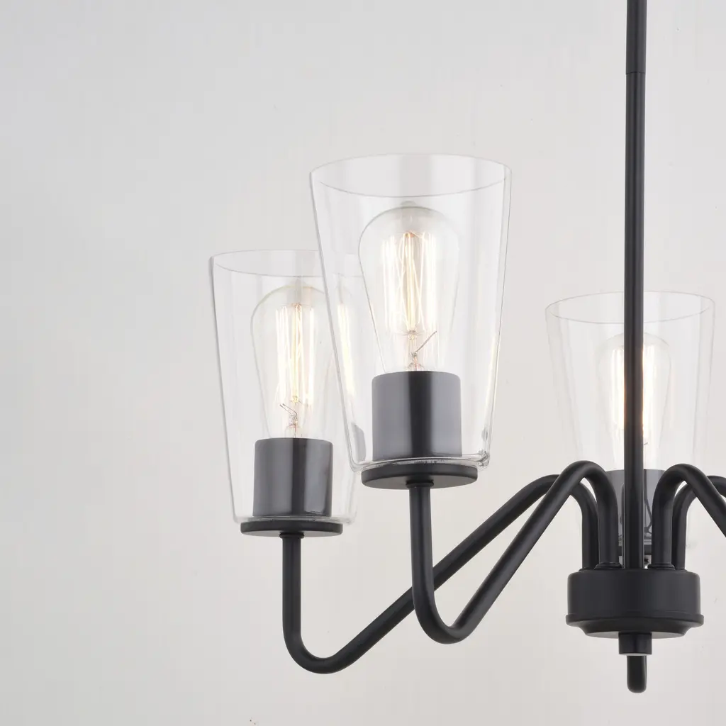 The Beverly collection provides a modern take on classic elegance. Uniquely curved arms in a matte black finish gently support the clear tapered glass. Round matte black discs hold the glass creating an inviting aesthetic. Add this transitional style chandelier to any kitchen table, living area, or dining space for the ultimate addition of style.