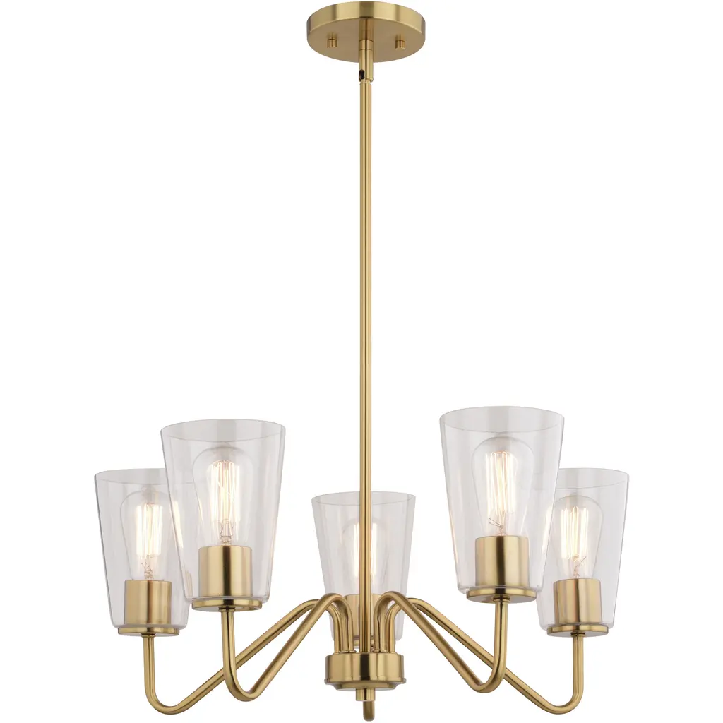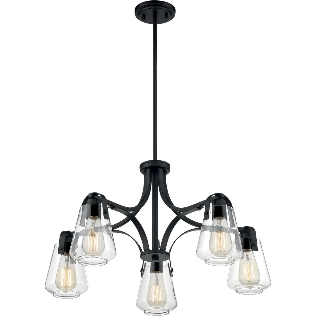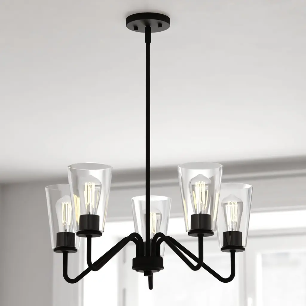 The Beverly collection provides a modern take on classic elegance. Uniquely curved arms in a matte black finish gently support the clear tapered glass. Round matte black discs hold the glass creating an inviting aesthetic. Add this transitional style chandelier to any kitchen table, living area, or dining space for the ultimate addition of style.