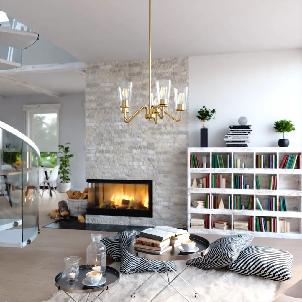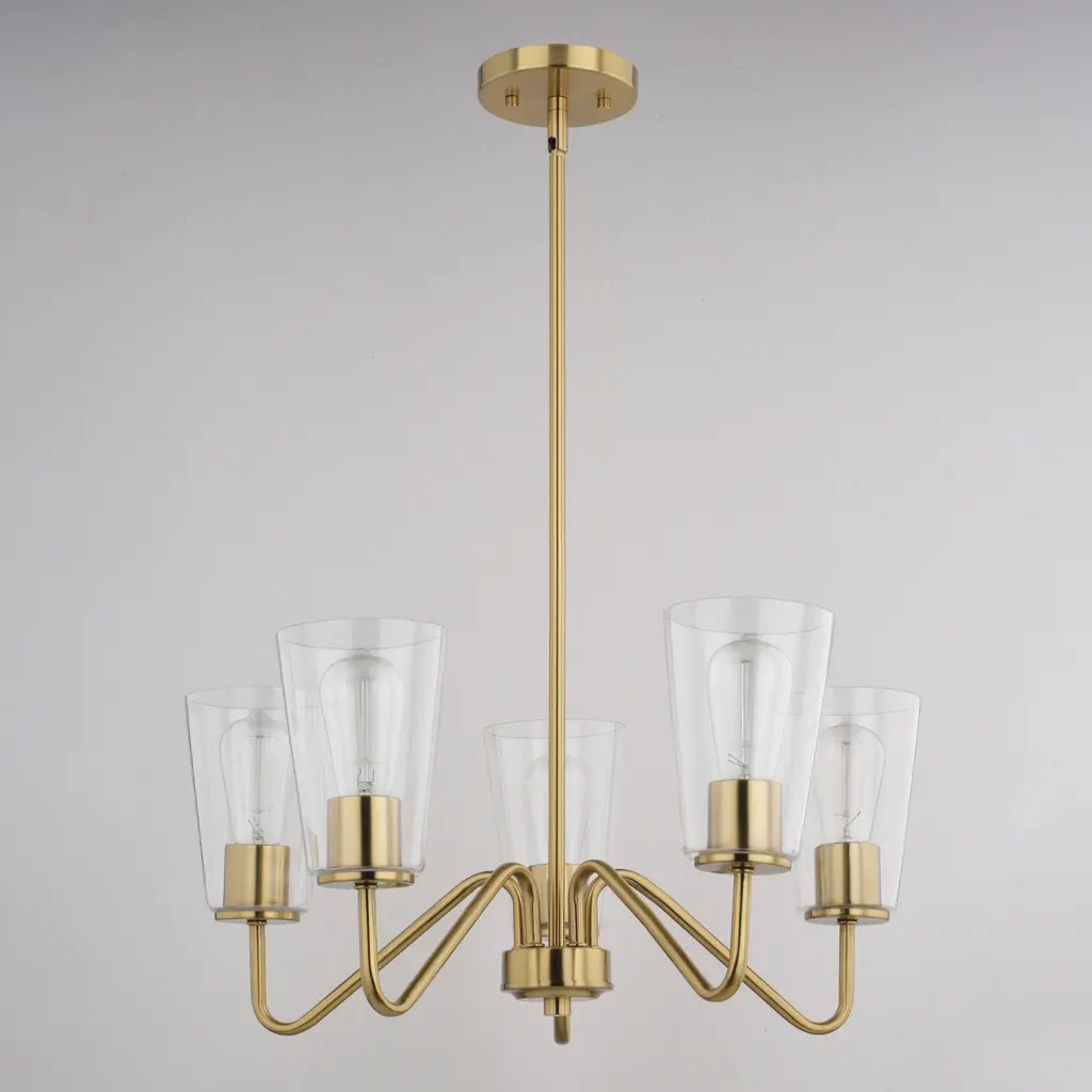 The Beverly collection provides a modern take on classic elegance. Uniquely curved arms in a muted brass finish gently support the clear tapered glass. Round matte black discs hold the glass creating an inviting aesthetic. Add this transitional style chandelier to any living area, or dining space for the ultimate addition of style.