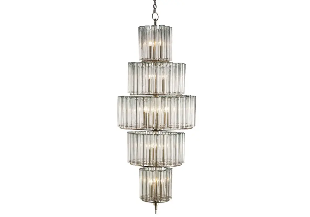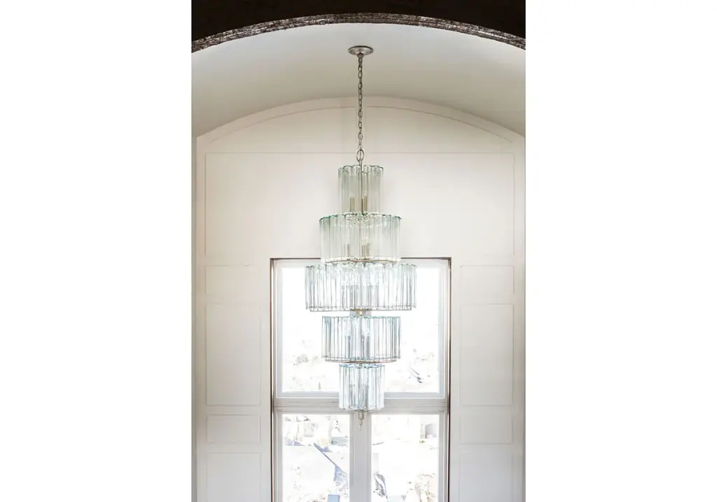 The Bevilacqua Chandelier is a magnificent toast to good taste. Full of body and grace, its reflective glass flutes are made from recycled bud vases. Its wrought iron frame is finished in an exquisite Silver Leaf that compliments the Bevilacqua's structured design.Dimensions: 68" H | 27" D Available in multiple sizes. Finish: Silver Leaf Chain Length: 8 ft