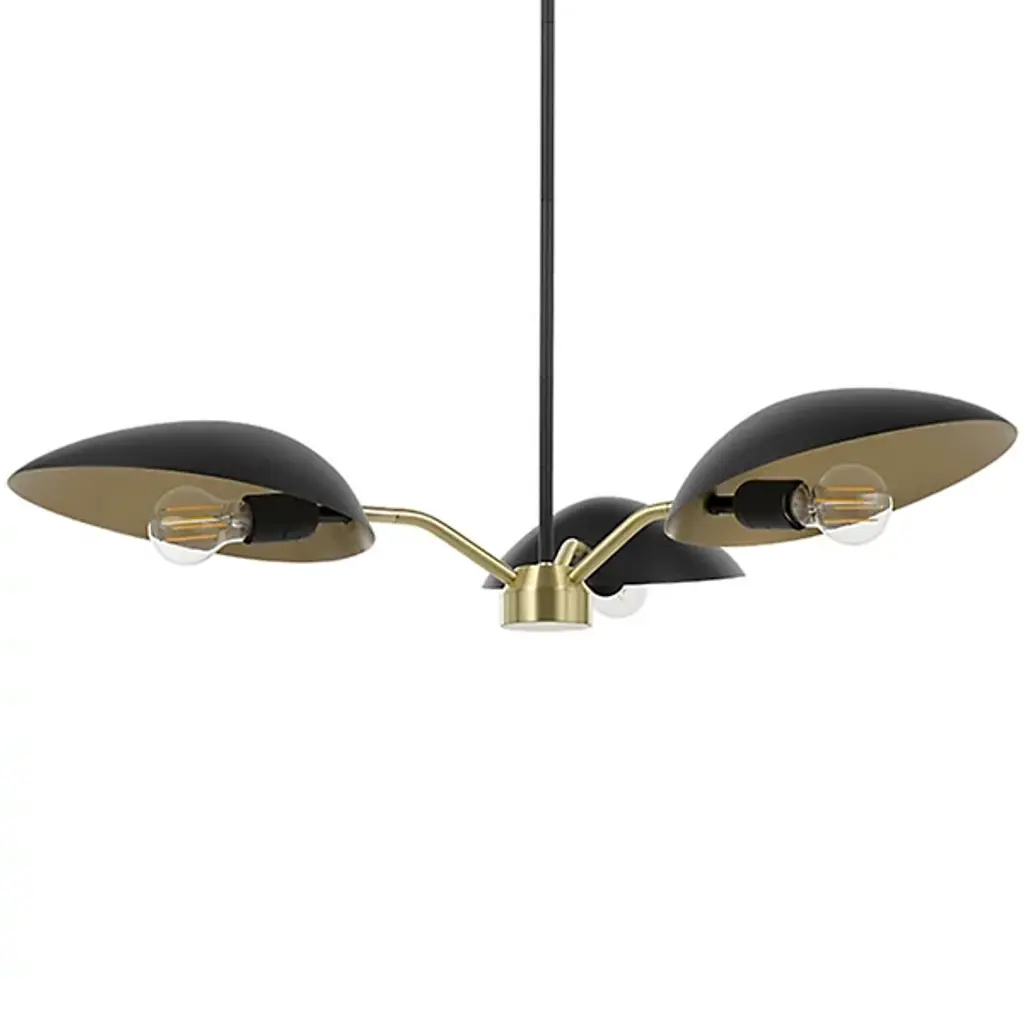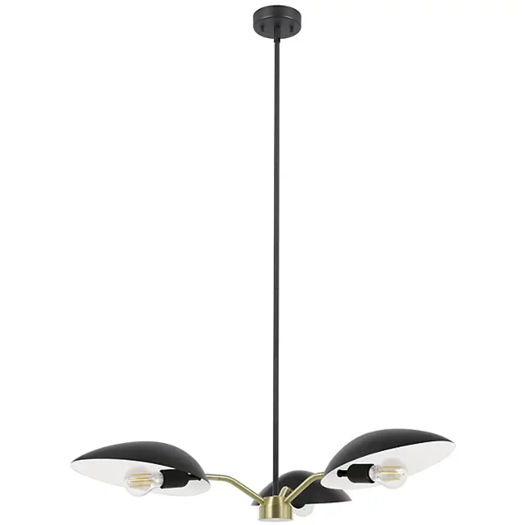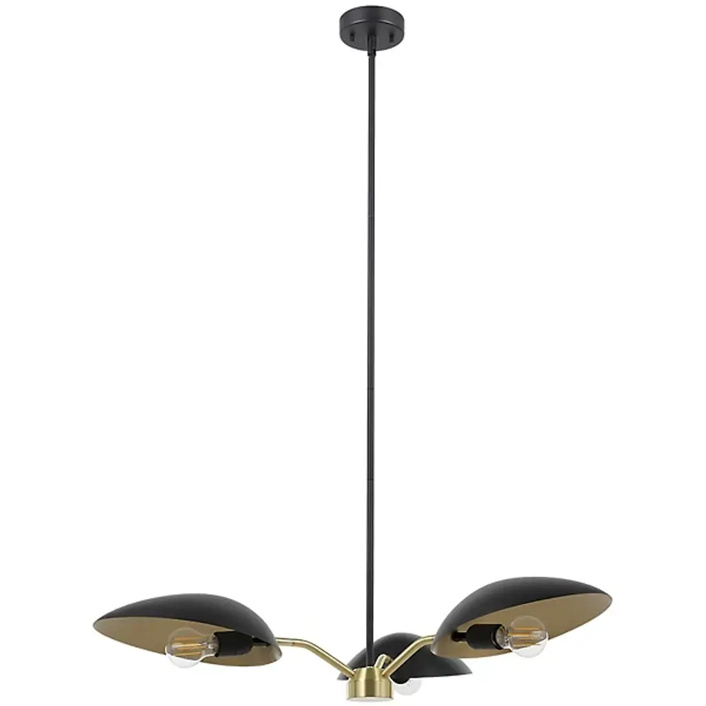 Modern lighting with stylishly retro curves. The Bexley Chandelier by Huxe shows off its mid-century modern lineage in the distinctive, elongated curve of its metal shades and the angular arms that hold them. The shades are arranged evenly around the bottom of the slim stem. The slightly tilted positioning of the shades and added width provided by the arms help ensure a wide wash of downlight onto a dining table or other surface.