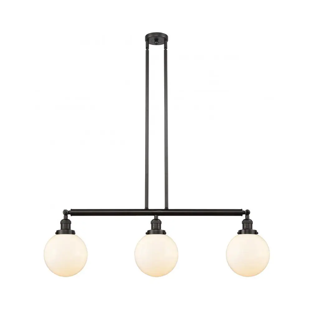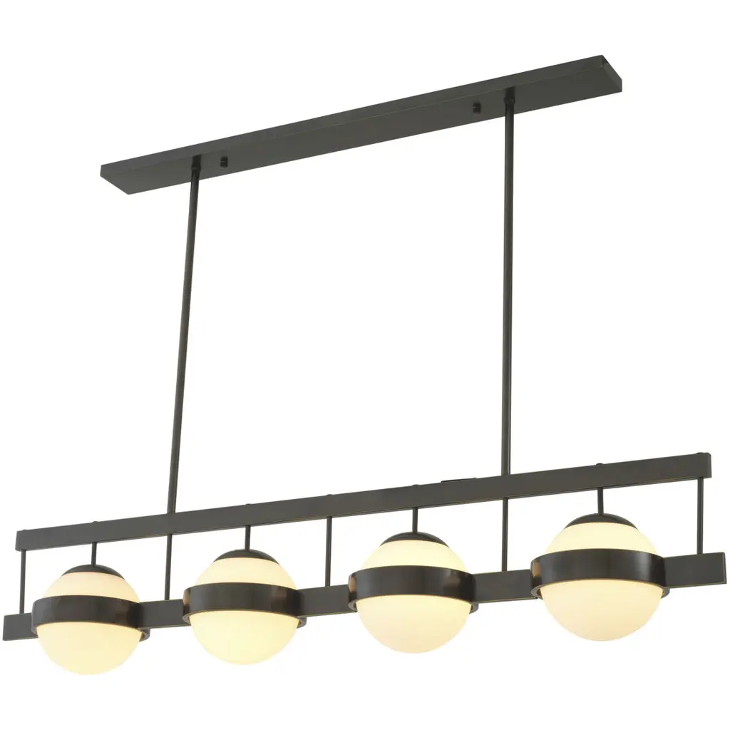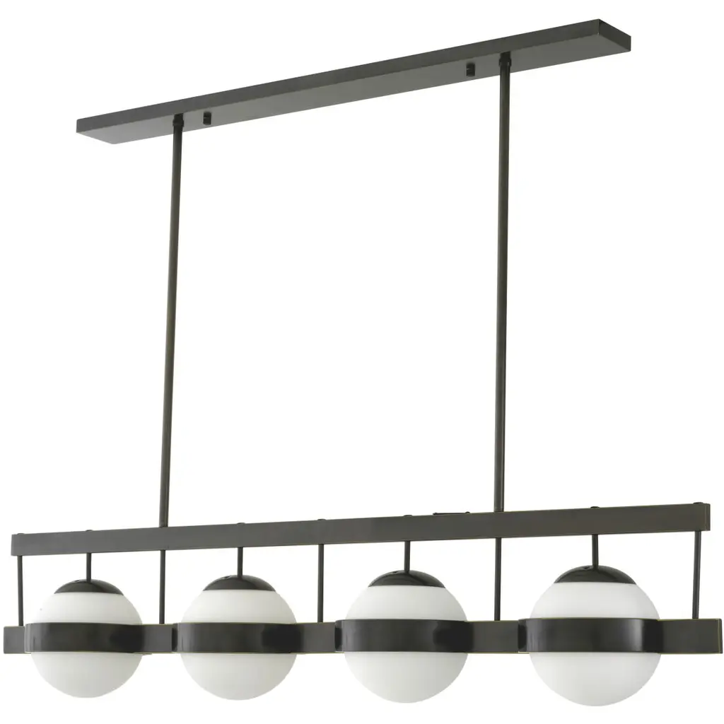 Mid-Century Modern in style, Chandelier Biba is a great lighting solution for contemporary open plan living areas. This handsome linear bar pendant features a rectangular frame with an antique brass finish that holds 5 white glass globes. It works really well over a large dining table or kitchen island.