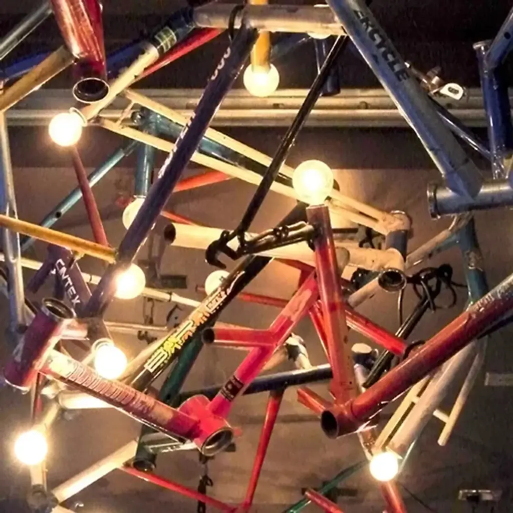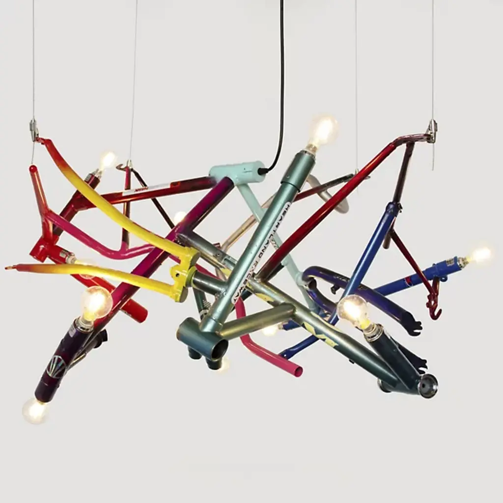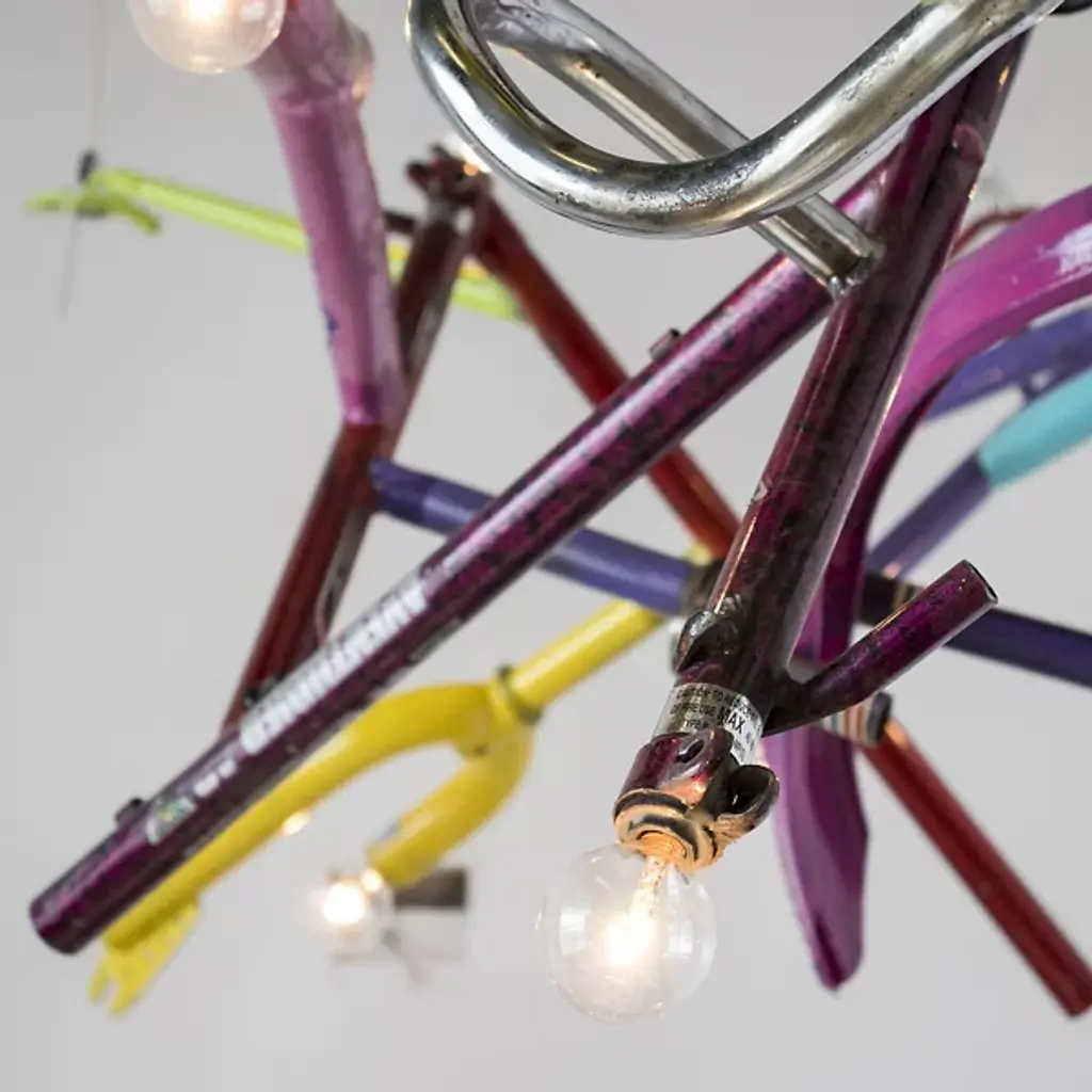 The Bicycle Round Chandelier from Ridgely Studio livens your living space with its chaotic, sculptural presence. A stand-out collaboration between Zac Ridgely and John Tong – each piece is made from interspersed, reclaimed bicycle frames, with open candelabra lamping set in its tubular framework. At the same time, near-invisible cables suspend its rounded form from above, giving the fixture an alluring, floating quality that is impossible to ignore. Each piece is truly one-of-a-kind, using different bicycle frames in varying orientations.
