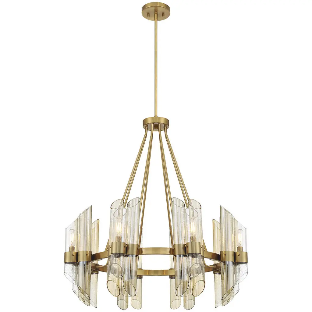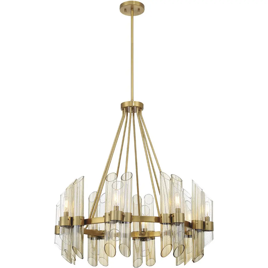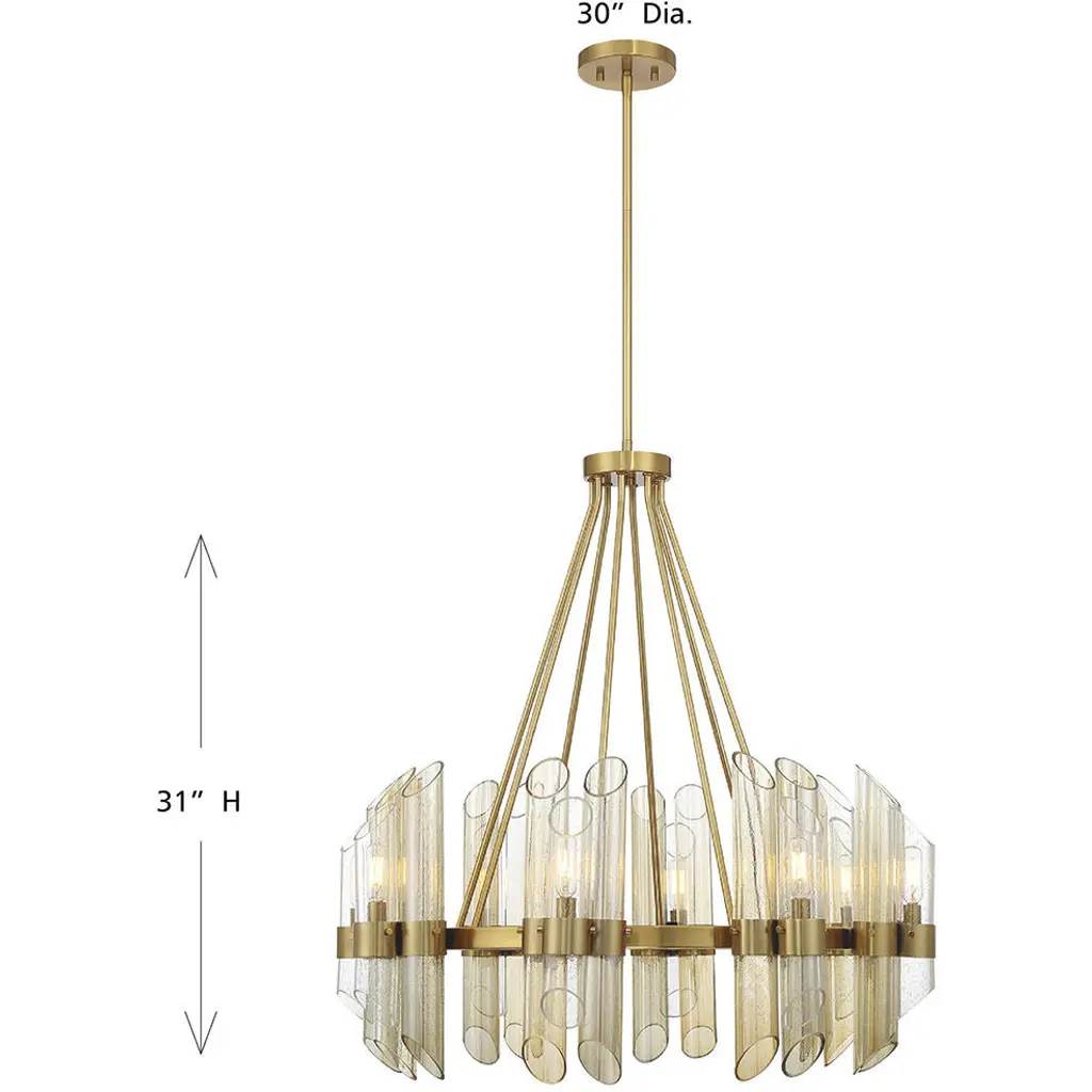 Adorn your home with the chic Art Deco style of the Savoy House Biltmore 8-light chandelier, which features pipes of marvelously multi-toned clear, champagne and smoked glass held in place by central belts finished in Warm Brass. Biltmore is 30" in width and has an adjustable height ranging from 31" to 85". Uses eight candelabra size bulbs of up to 60 watts per bulb. Bulbs not included.