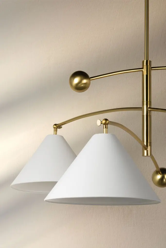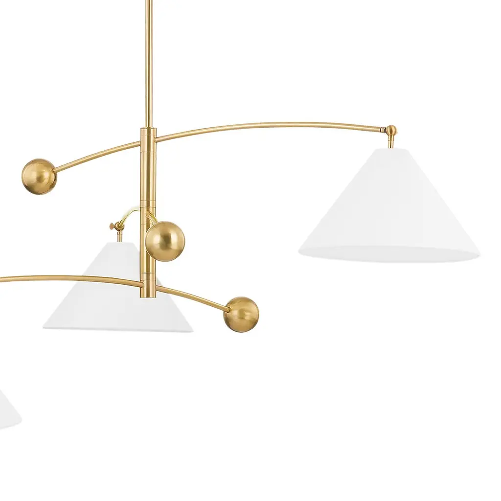 Reminiscent of kinetic sculptures, this chandelier features a Belgian linen shade on one end of its three curved arms and a brass ball on the other. The conical shades are positioned to ensure an even distribution of light.