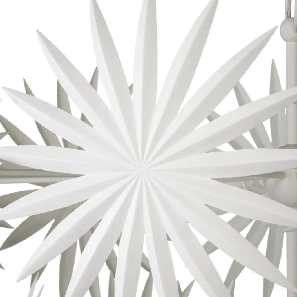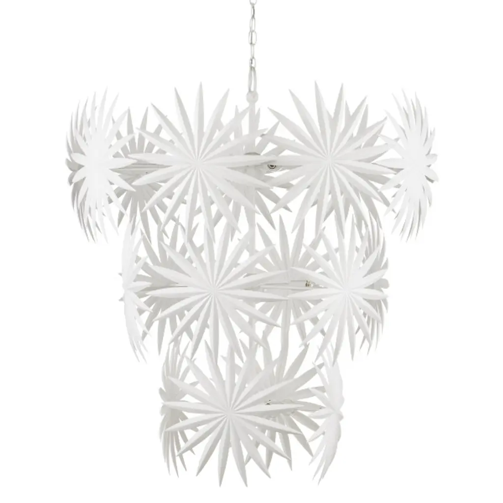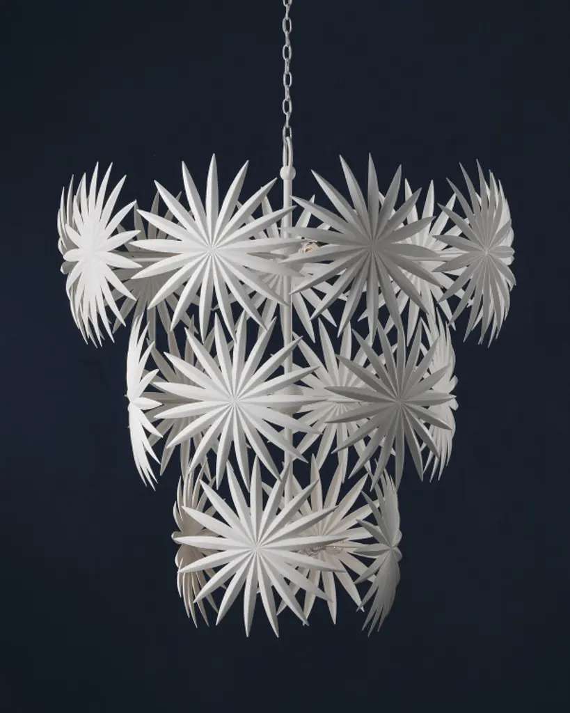 The Bismarkia Chandelier was inspired by the noble Bismarkia palm, whose fronds are remarkably large. Marjorie Skouras, who designed the chandelier, has stayed true to her love of nature for this creation. Her passion for the Yucatan, the surroundings in which she lives and through which she translates the flora and fauna into dynamic products in her studio, shines in this steel fixture. The spiky ornamentations that splay around the lights bring immediate texture to a space. Adjustable with use of included chain/rod kit/cable.