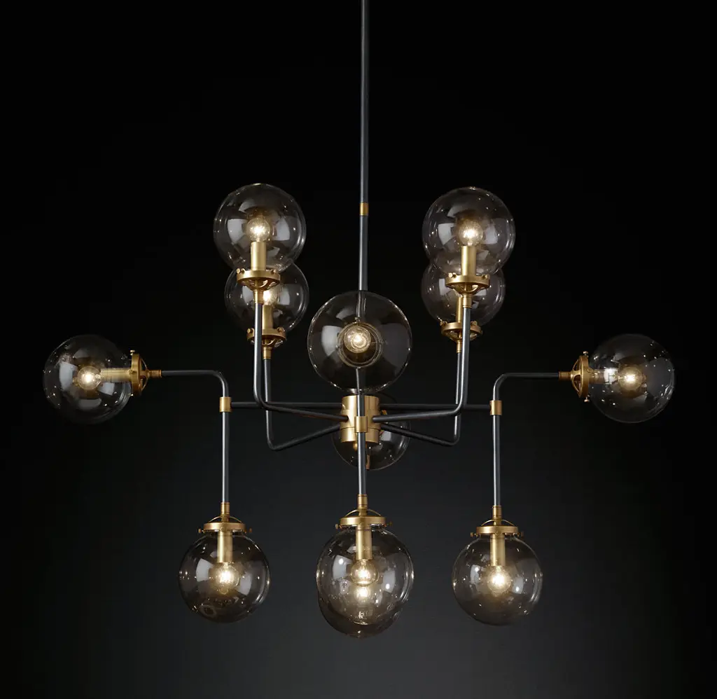 Inspired by 1940s industrialism, our globe chandelier's lines and spheres are reminiscent of an urban subway map. Twelve glass shades are joined by metal tubing and carefully balanced on vertical threaded rods. SHOP THE ENTIRE COLLECTION