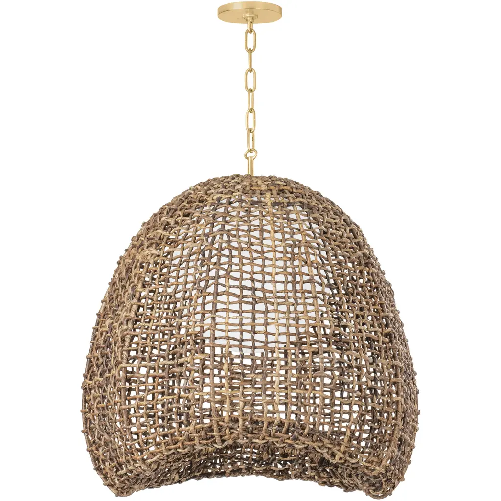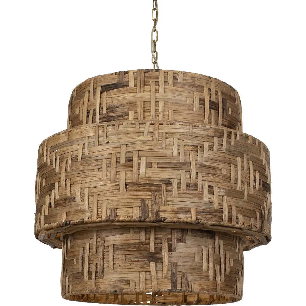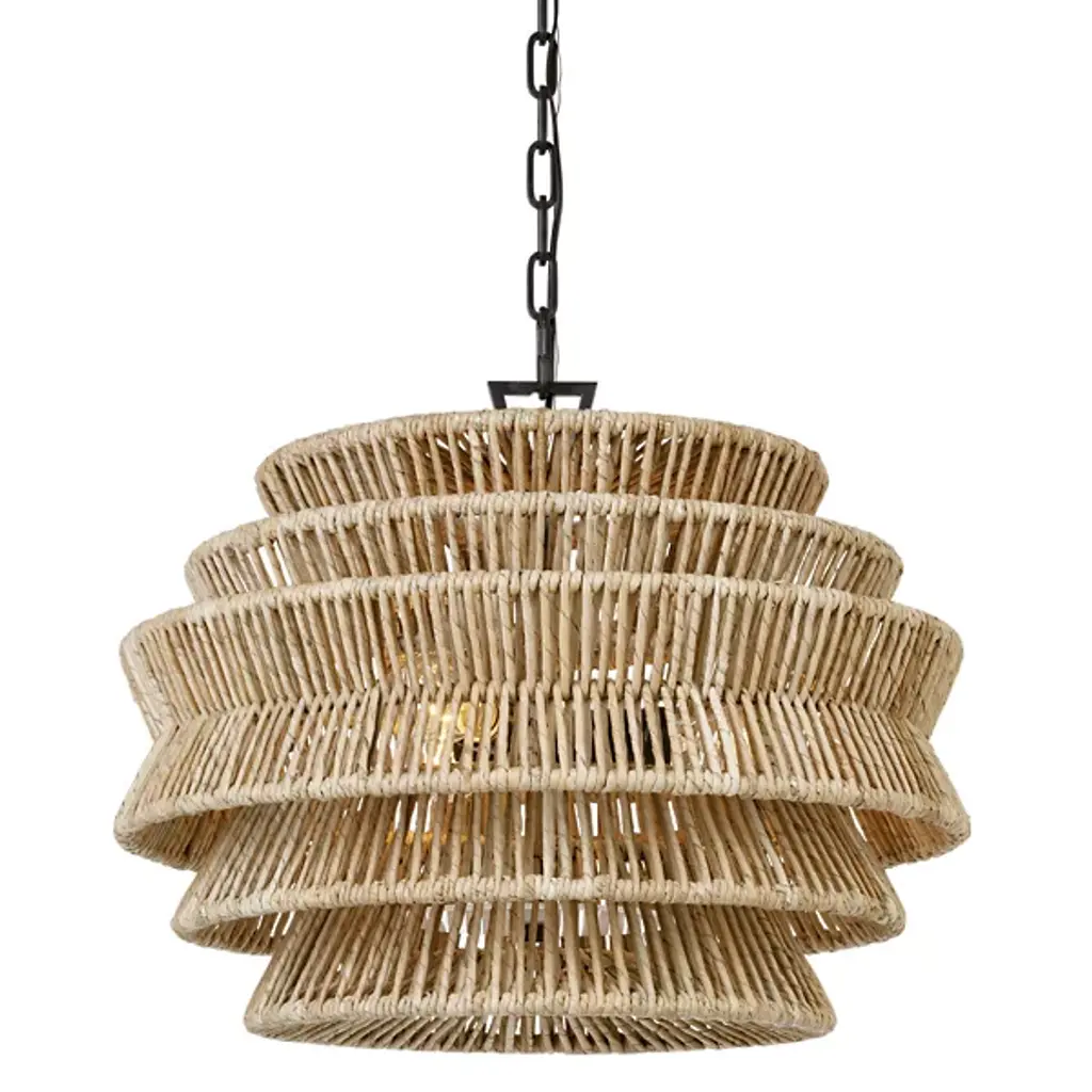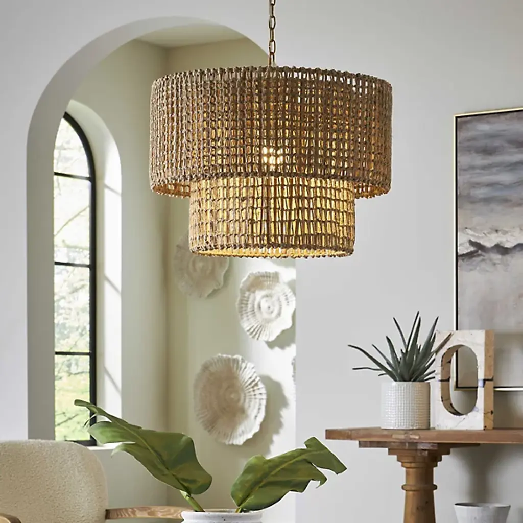 The Biswas Chandelier from Uttermost features a two-tier shade crafted from natural woven jute rope, exuding an effortlessly relaxed yet stylish charm. The design is elevated with antique brass accents, giving it a refined touch. This chandelier has a single 100-watt maximum Edison socket (bulb not included), offering functionality and aesthetic appeal. It comes with 15 feet of wire and a 7-foot chain, providing adjustable installation options to suit various spaces and ceiling heights.