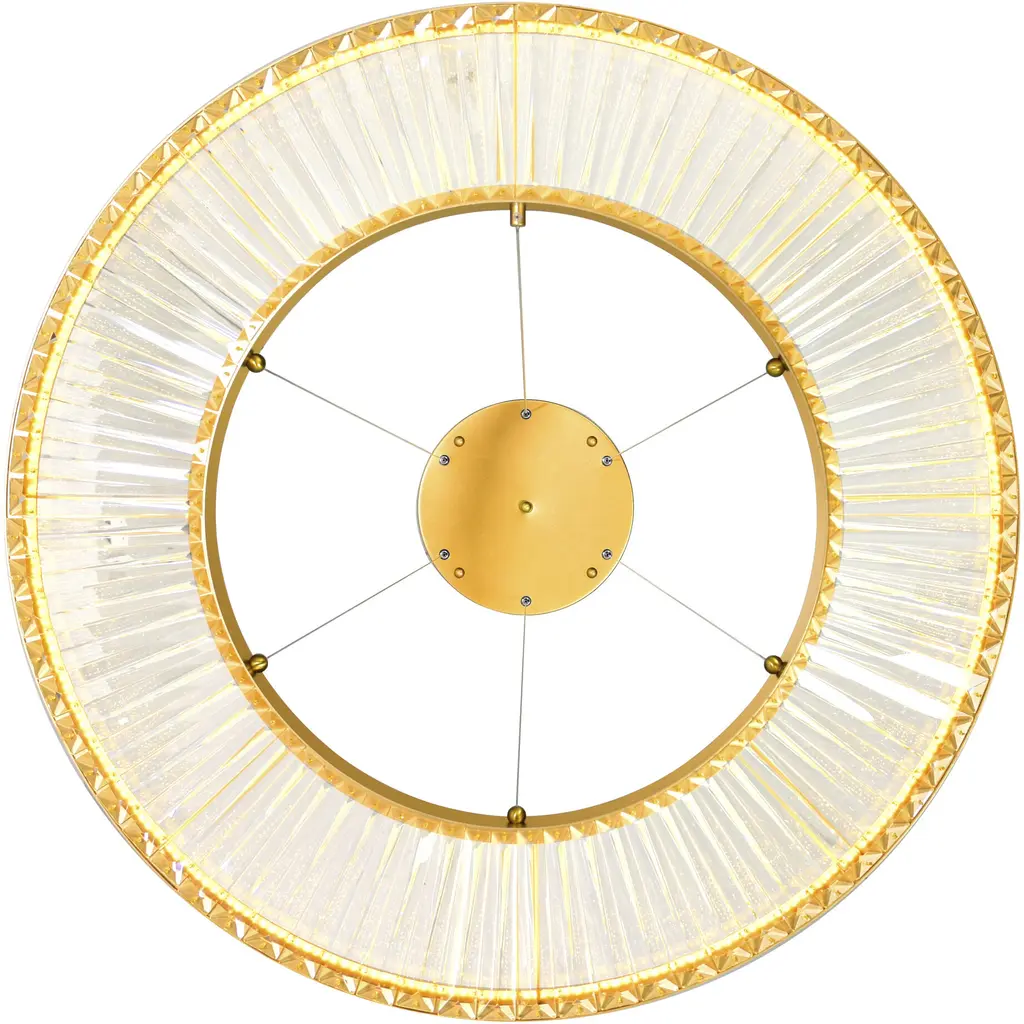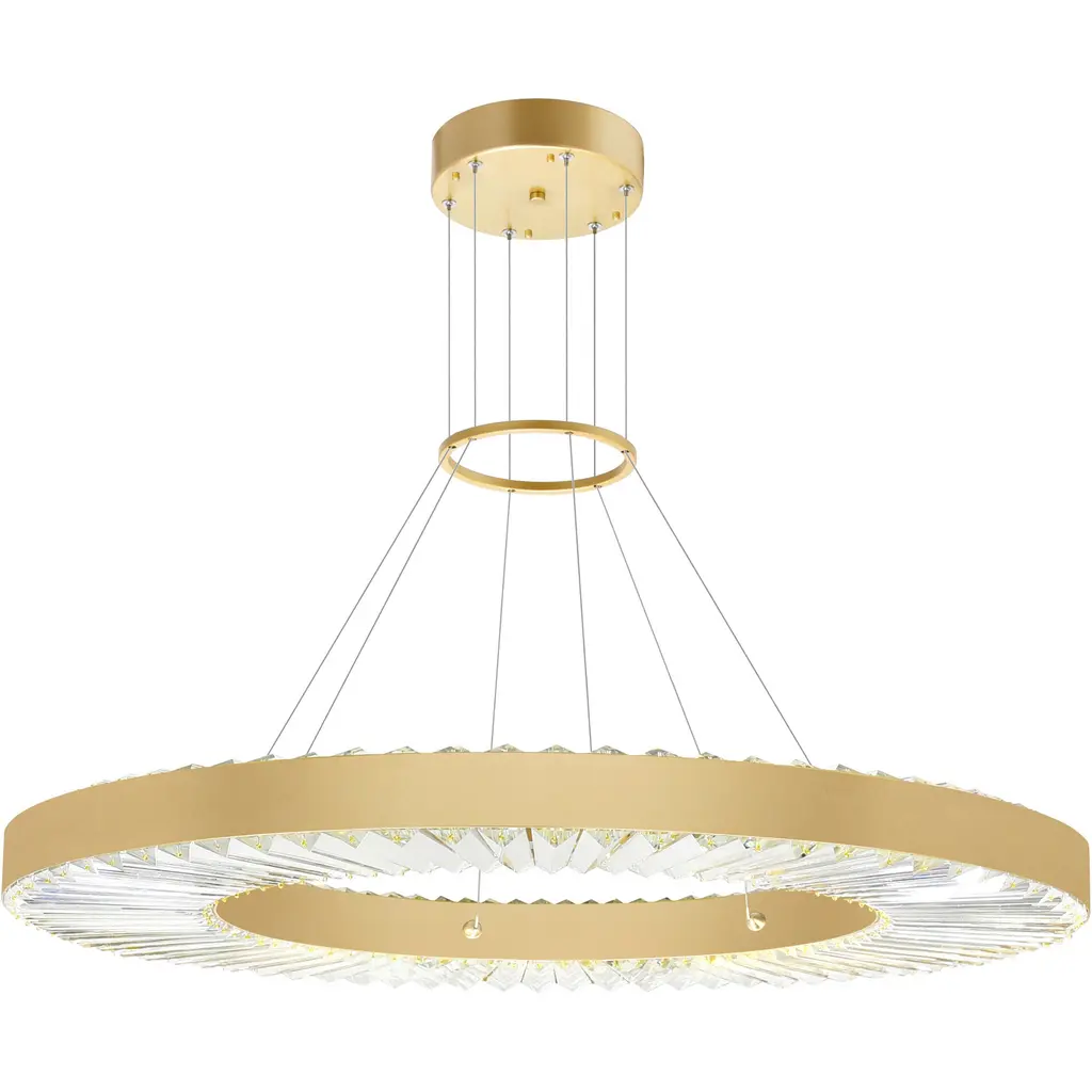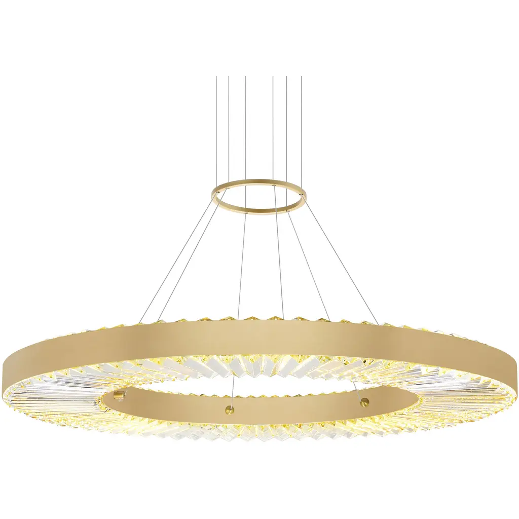 A functional dining room or living room chandelier with a circular shape, the oversized Bijoux 32 inch LED Chandelier in Brass will certainly capture the attention of your guests. This light fixture reflects the sophistication of clear crystals and the contemporary flair of geometric luminaires. Add instant drama to your living space with this brass-finished circular LED chandelier.