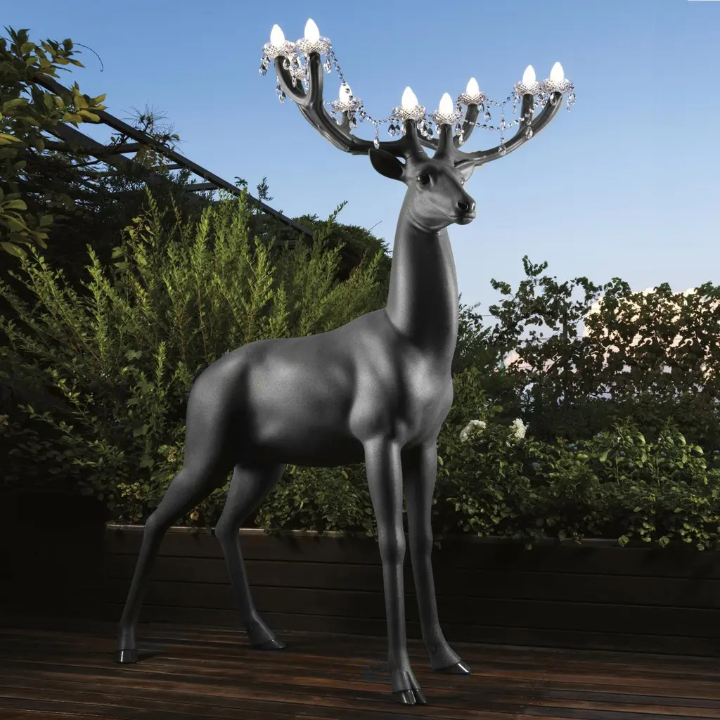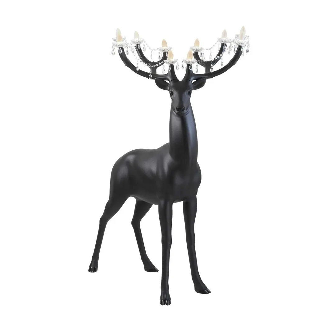 6.5ft Tall Black Sherwood Deer chandelier by MarcantonioSherwood is an impressive 2-meter-high deer whose antlers become chandeliers decorated with crystals and pendants.The strong natural energy of the animal is immortalized by Marcantonio who imagines the deer moving proudly in a forest creating, thanks to its mighty luminous horns, magical glows in the night, as if it were a guide to follow. In this dreamlike universe between fantasy and reality Sherwood becomes the protagonist of indoor and outdoor spaces.Made in Italy.