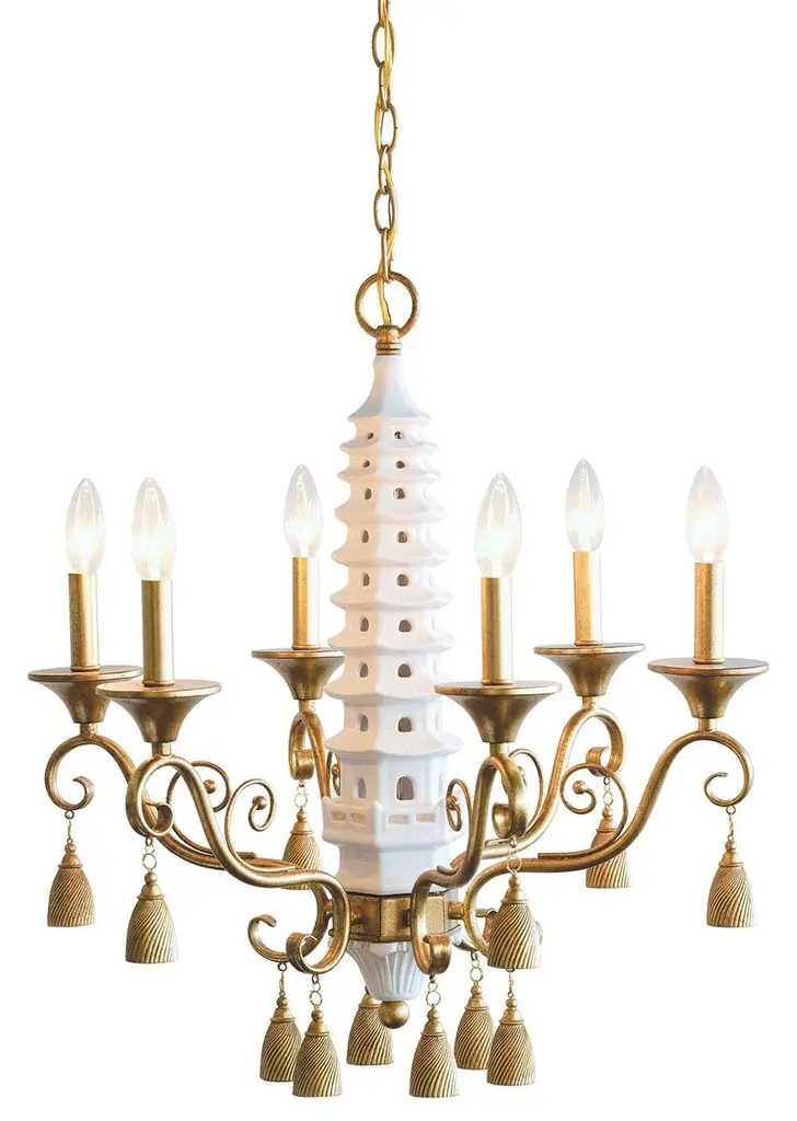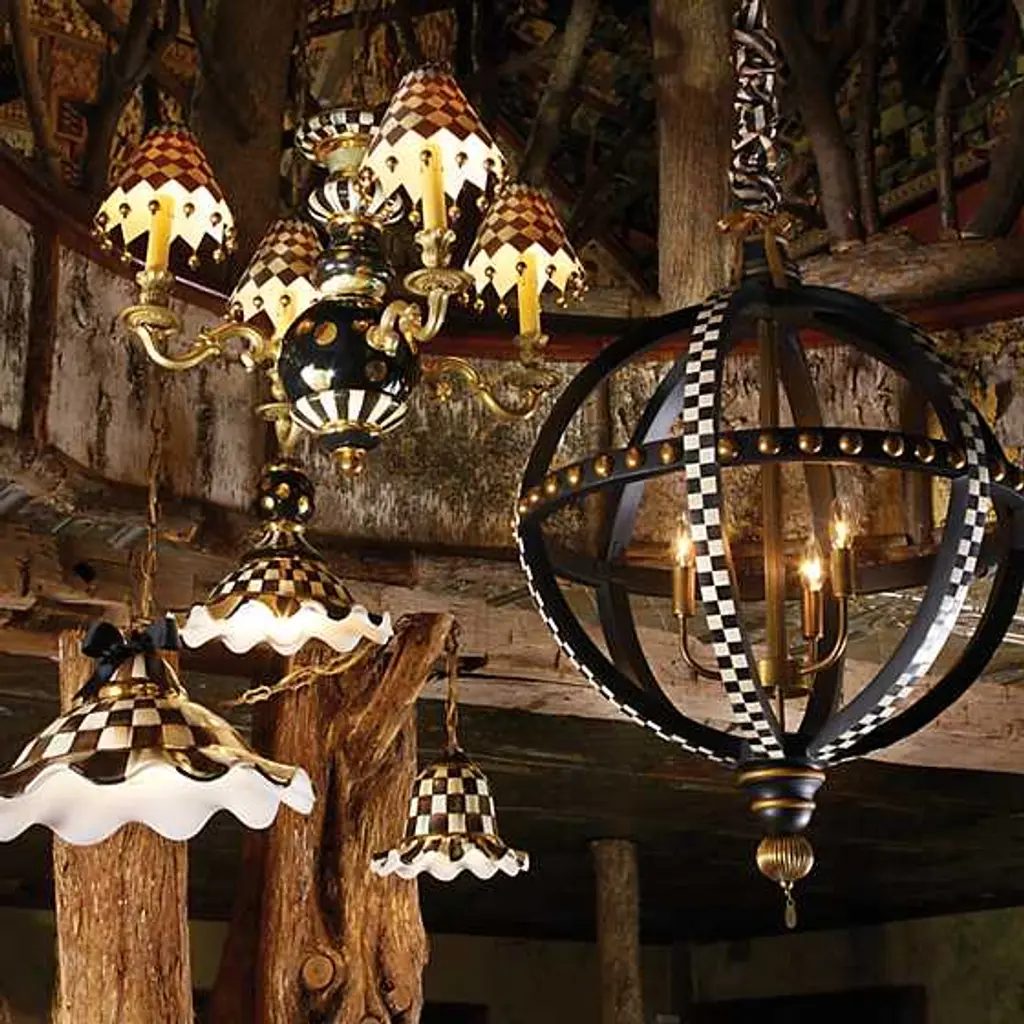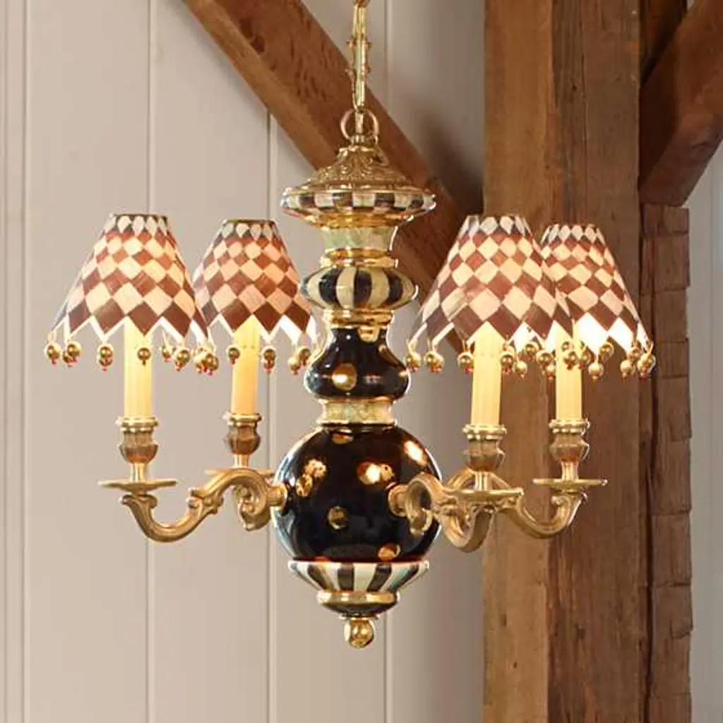 Elegantly illuminating. If you believe that no occasion is too casual for a little black dress, and that caviar and eggs makes the perfect breakfast, our Black Tie Chandelier will appeal with dressed-to-the-nines drama. The talk of the town, this captivating chandelier is handmade of clay and hand-painted by our master artisans in Courtly Checks® and Stripes with faux-marbled accents. Watch the light dance off the intricate interplay of patterns, embellished with gold lustre polka dots and bands. Brass arms and hand-painted hard paper Courtly Check® shades. Irresistible.