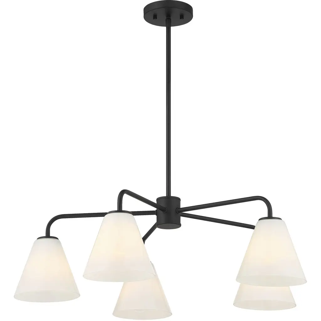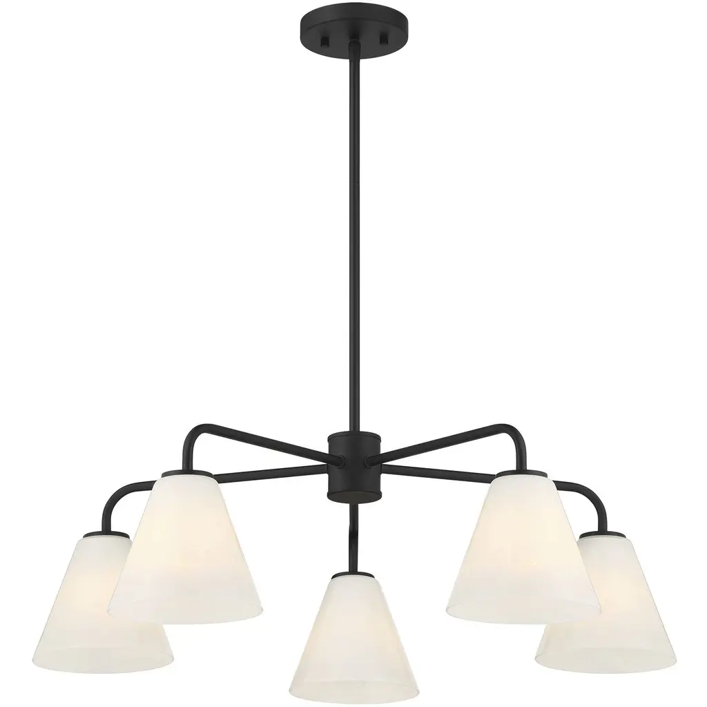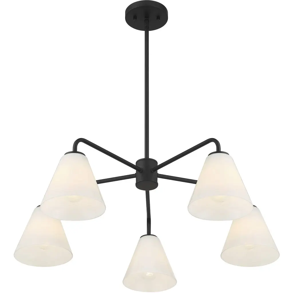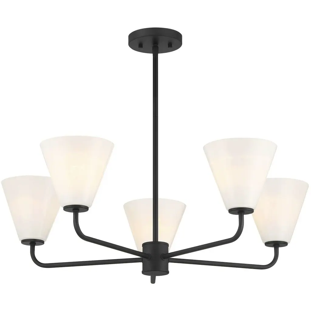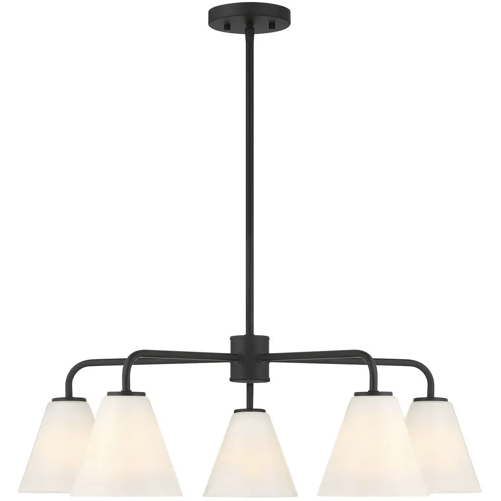 This Savoy House Blair 5-light chandelier is oh so versatile It can be installed with the lights facing up or down, making it perfect for meeting every lighting need. Slender, sleek arms are finished in Matte Black and topped with shades of spectacularly swirling strie glass. Blair is 30" in width and has an adjustable height ranging from 9.25" to 63.25". Uses five standard size bulbs of up to 60 watts per bulb. Bulbs not included. Comes with four 12" downrods and one 6" downrod.