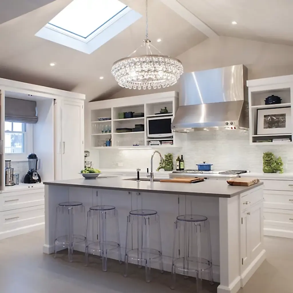 The beauty of Bling on a truly grand scale. The Robert Abbey Bling Large Chandelier features numerous round and pear-shaped glass drops draped in multiple layers around the wide (nearly 3 feet around) metal frame. These drops create a decidedly appetizing sparkle that's ideal for modern dining rooms.