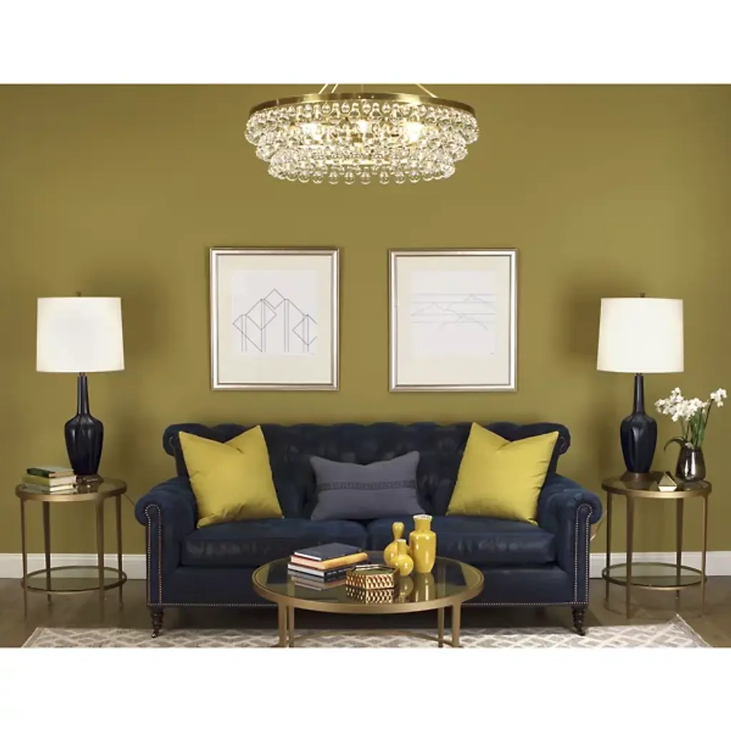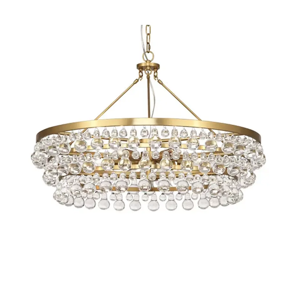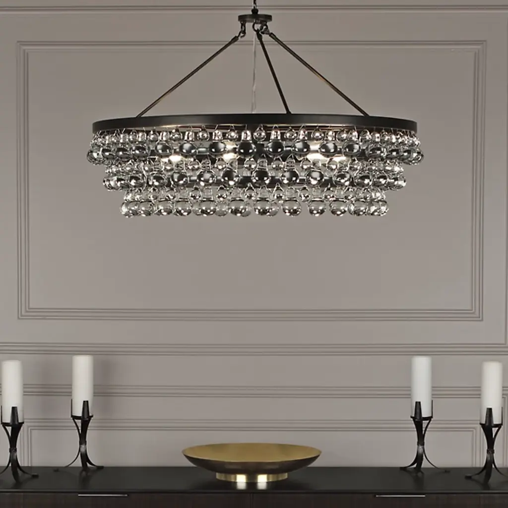 The beauty of Bling on a truly grand scale. The Robert Abbey Bling Large Chandelier features numerous round and pear-shaped glass drops draped in multiple layers around the wide (nearly 3 feet around) metal frame. These drops create a decidedly appetizing sparkle that's ideal for modern dining rooms.