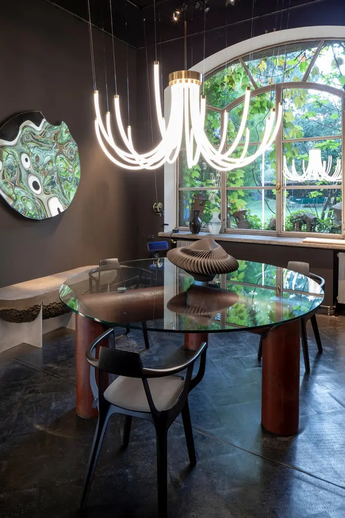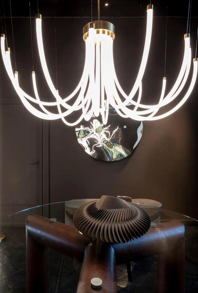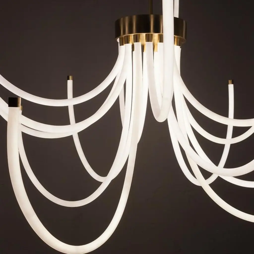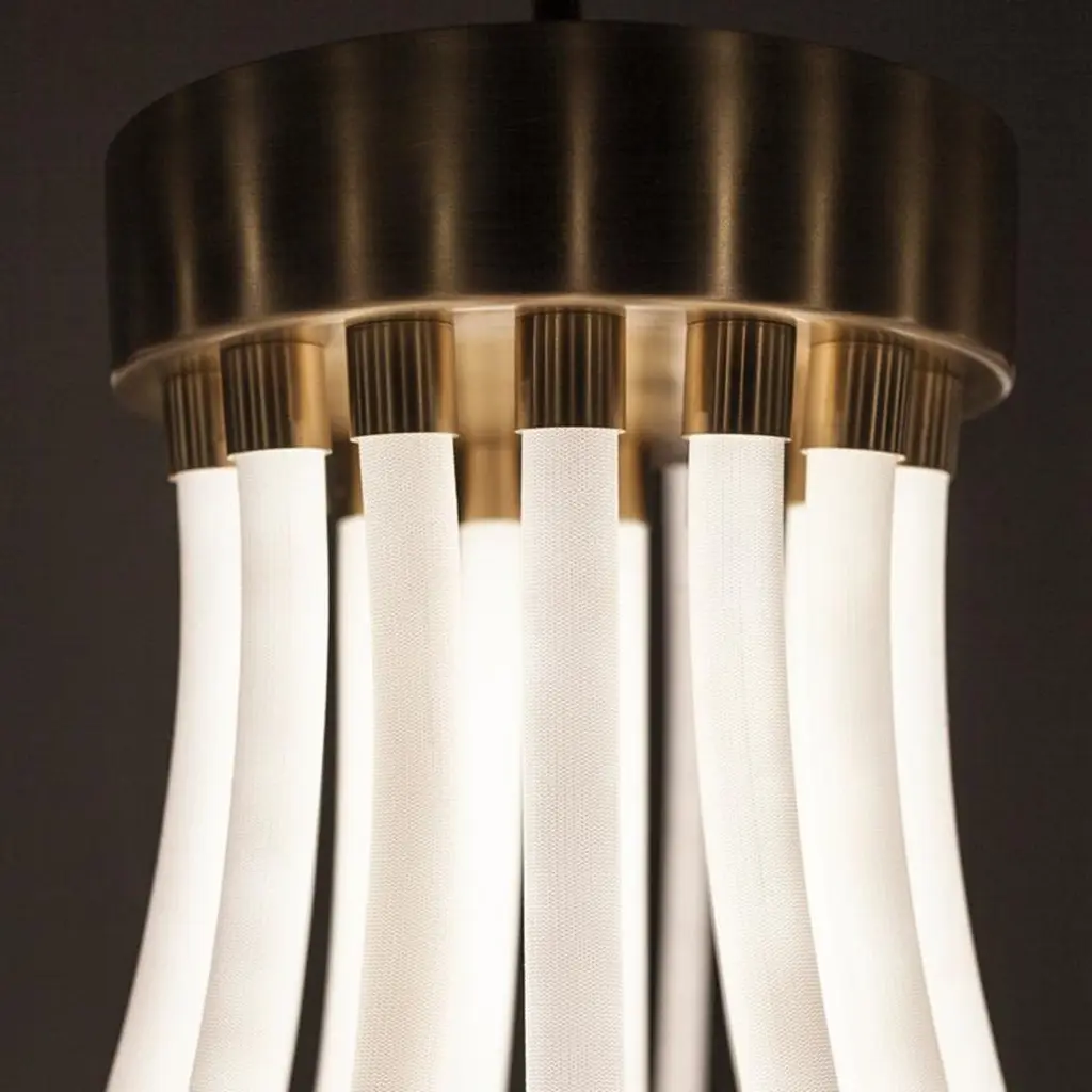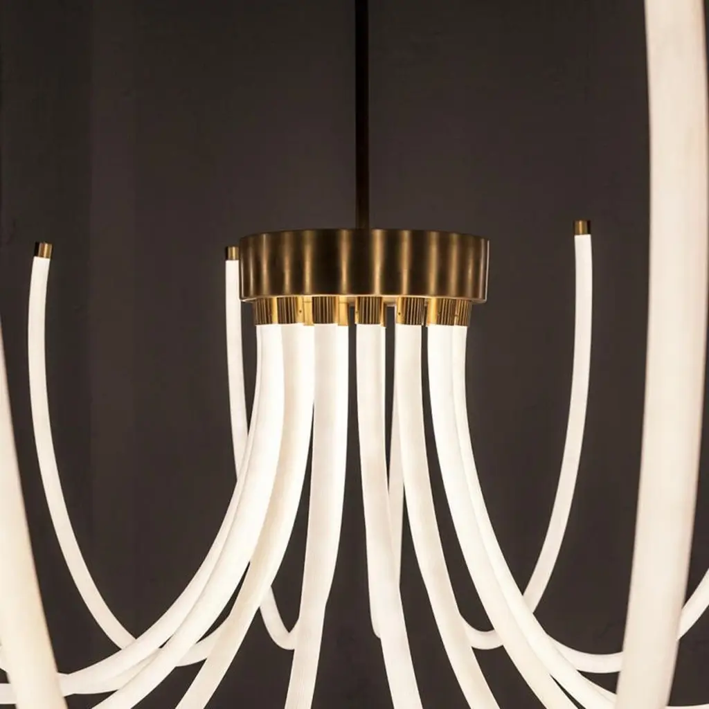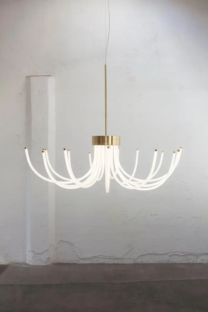 Bloom is a site specific evaluative piece. Each of its 15 arms, made of fabric flexible light, is connected to a central origin that reminds of historical ceiling chandeliers. The arms can be customized in length, position and shape, for better fitting the space and personal taste. Bloom grows and stands as an abstraction of a memory with a contemporary Aurea. The fabric that covers the light source enhances its appearance during night and daytime.Additional information:Materials: Brass, fabric, led, organzaDimensions: Ø 160 x H 100 cm : The diameter can range approximately between of 120 and 160 cm Available color / finishes: Customizable.