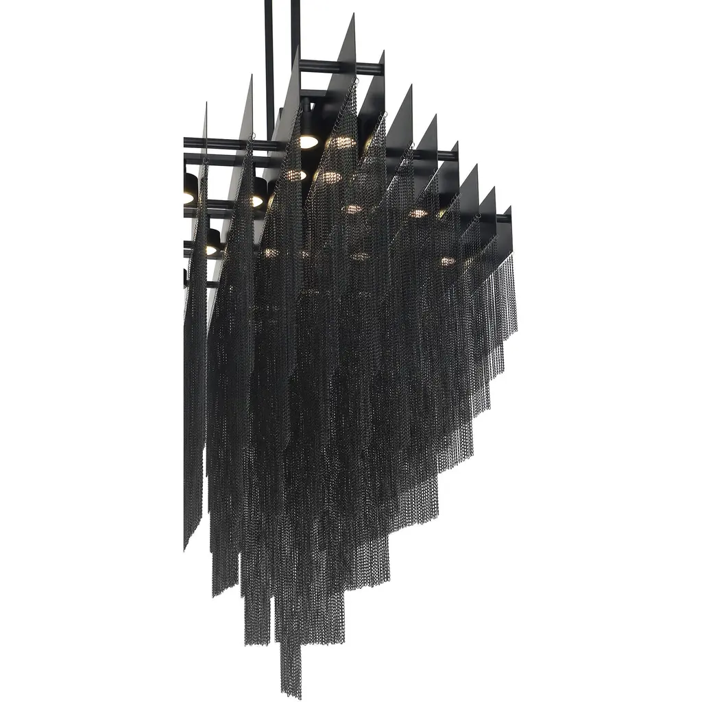A lustrous collection of delicate, high-gloss metal chains cascade like gleaming streams of water in this transitional piece. Resembling armored chain mail, the polished, plated mesh envelops each integrated LED light to add a soft, shimmering glow.