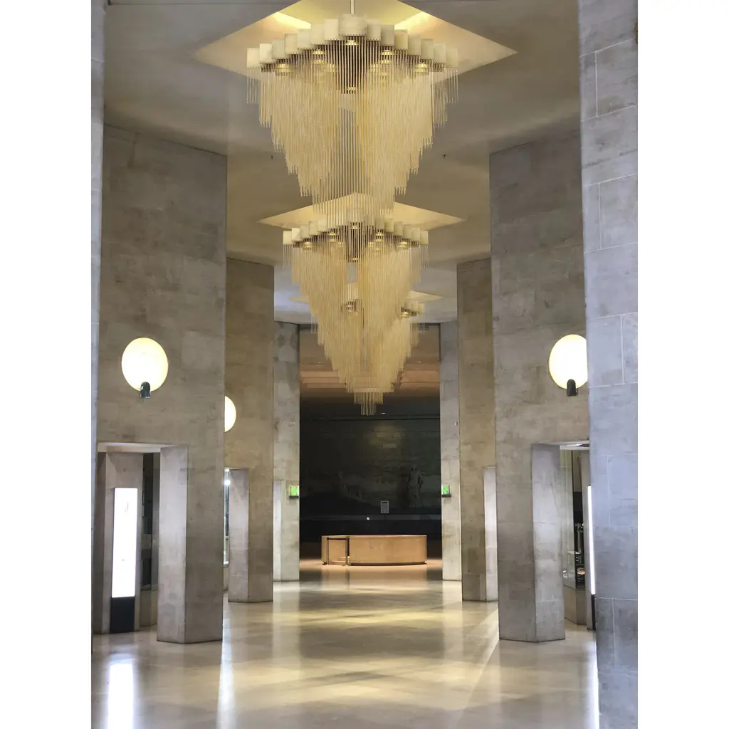 A lustrous collection of delicate, high-gloss metal chains cascade like gleaming streams of water in this transitional piece. Resembling armored chain mail, the polished, plated mesh envelops each integrated LED light to add a soft, shimmering glow.