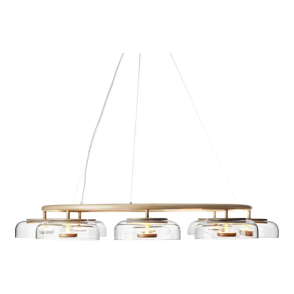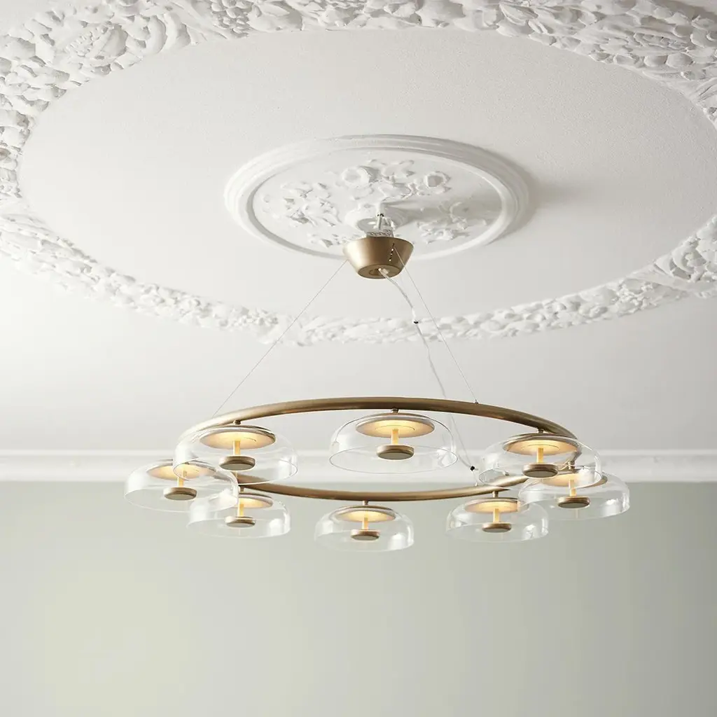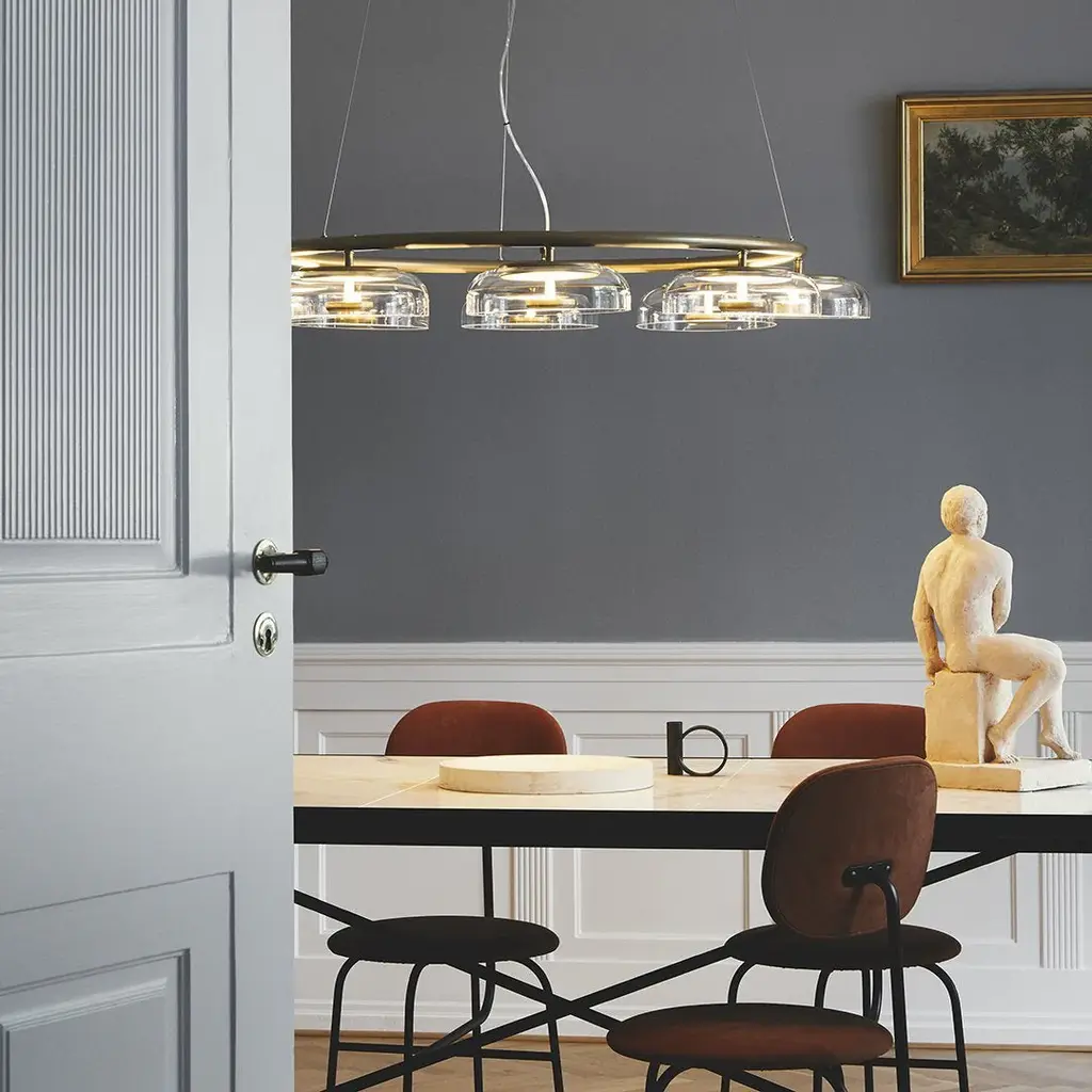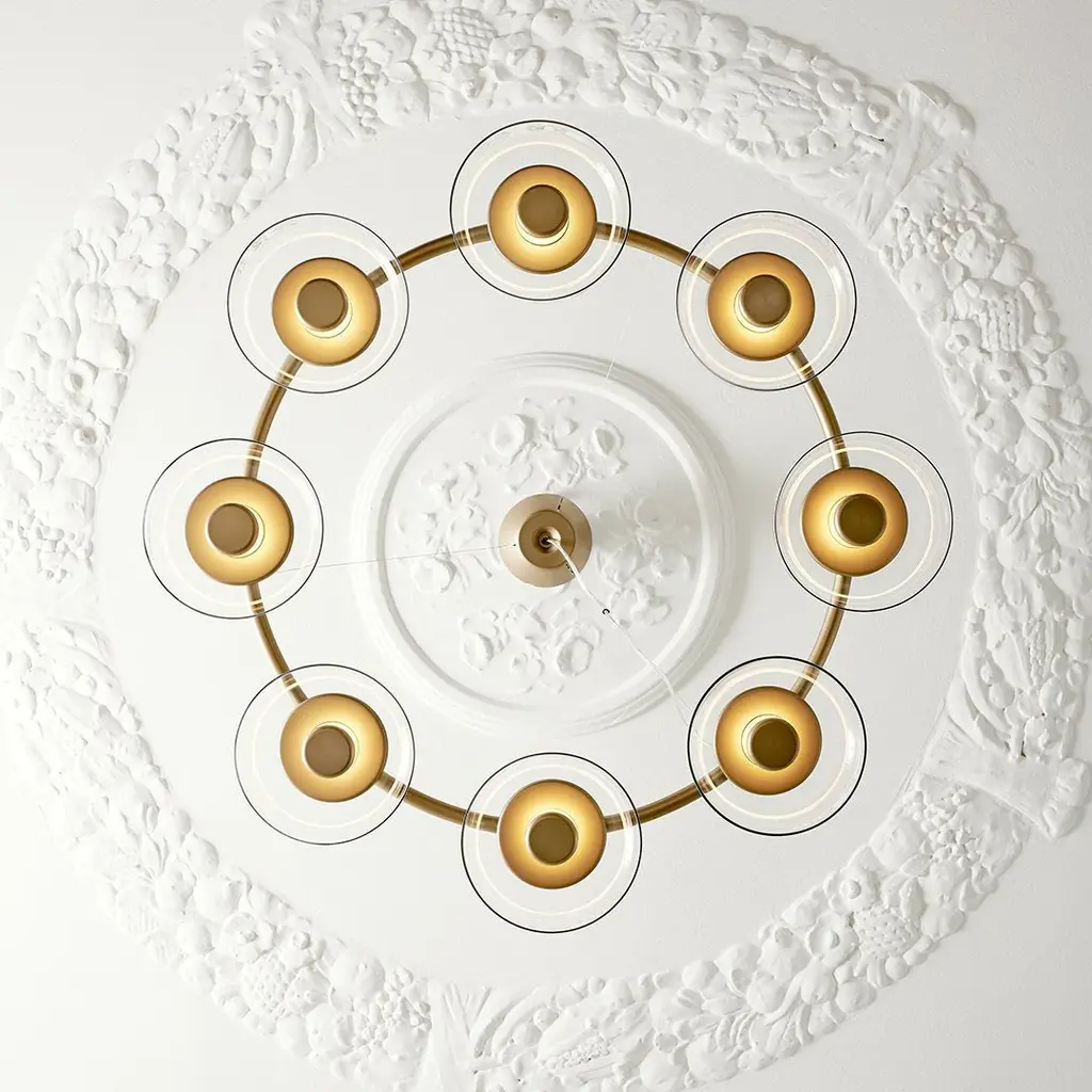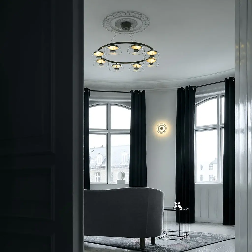 Blossi 8 is a modern chandelier, inspired by the golden light during autumn. The Blossi collection is produced with advanced LED technology. A special developed LED disc reflects the light in the mouth-blown glass shades, spreading a soft and indirect light.