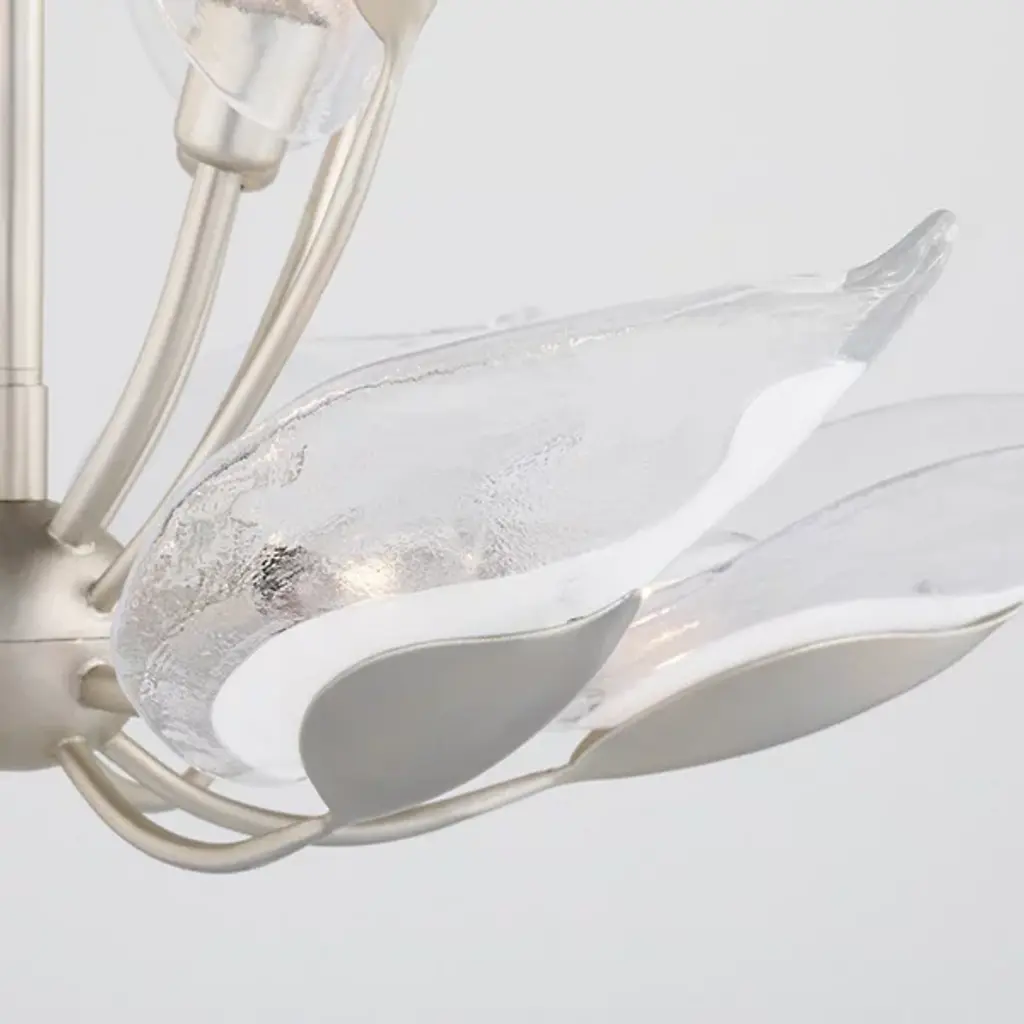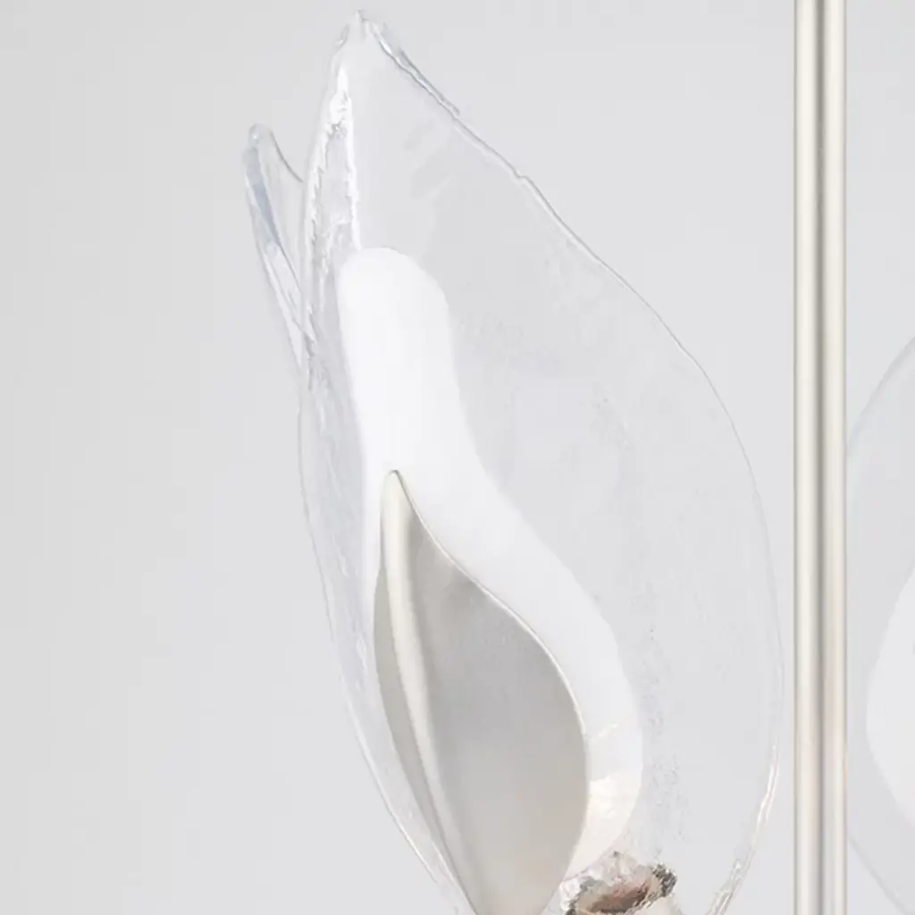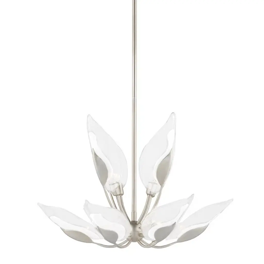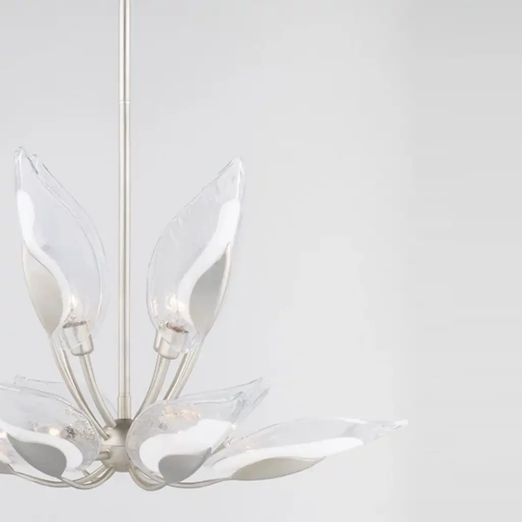 The Blossom 2 Tier Chandelier by Hudson Valley Lighting is an elegant design that showcases handcrafted artisanal Piastra glass leaves. Each leaf is hand-formed and cut to shape and elevated with a dollop of white glass to create a lovely landscape for light to filter through. Gracefully curved arms expand from a spherical center to support each leaf, lending them a layered look as they expand along the back of each with a matching silhouette. This captivating display brings a bright and beautiful touch to the spaces it is in.