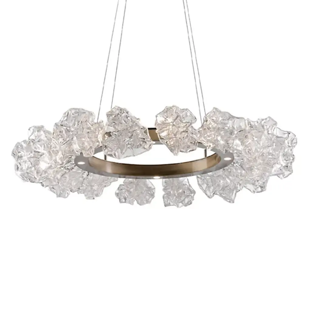 Like a diamond ring elegantly suspended above your favorite living room, the Blossom Ring Chandelier from Hammerton Studio exudes sophistication with an easy, eye-pleasing design. Balanced by four even wires, the thick metal frame contains four integrated LEDs, each one evenly spaced on the underside of the piece. Along the perimeter of the ring is a series of hand-blown, blossom-shaped glass shades. When turned on, the energy-efficient light of the LEDs plays with the blossom shades, gently diffusing through the intricate glass and spreading smoothly throughout the space.