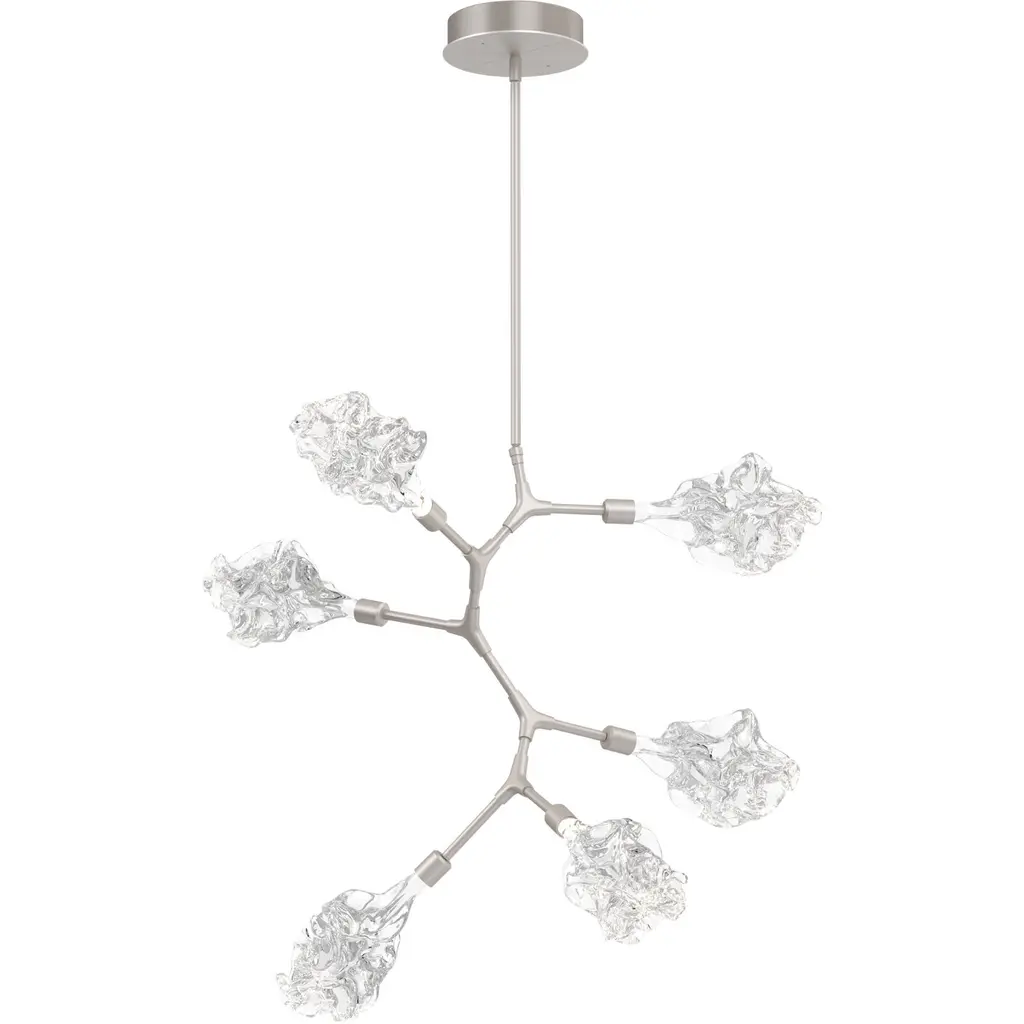 Bring soothing allure to your home with the Blossom Modern Branch LED Chandelier from Hammerton Studio. A disc-shaped ceiling mount extends a thin, shining branch-like body that splits into distinct arms. Each brief arm ends with unique, handblown glass shades that somewhat resemble flowering buds. Integrated, energy-efficient LED modules rest within each bud, bringing a glowing life to the piece as a warm, inviting illumination softly spreads across the space, creating a relaxing, enchanting ambiance.