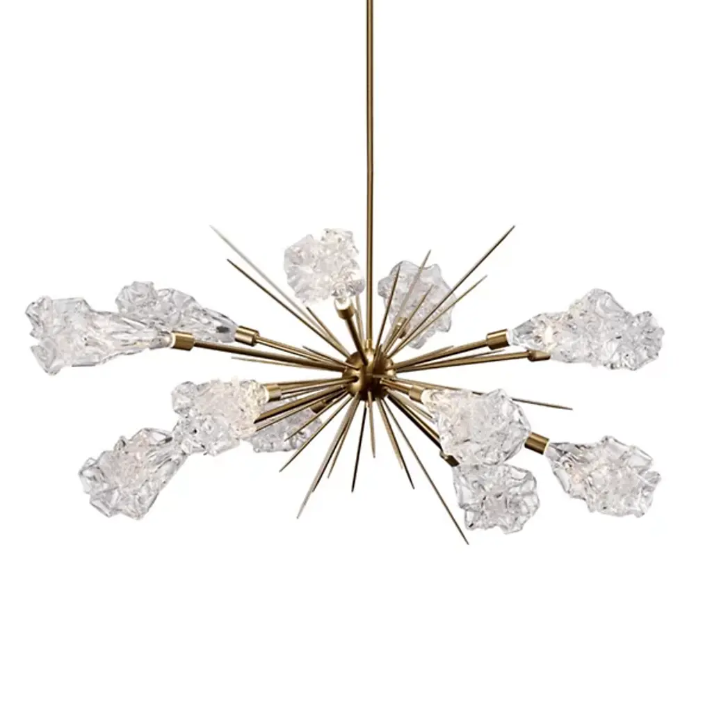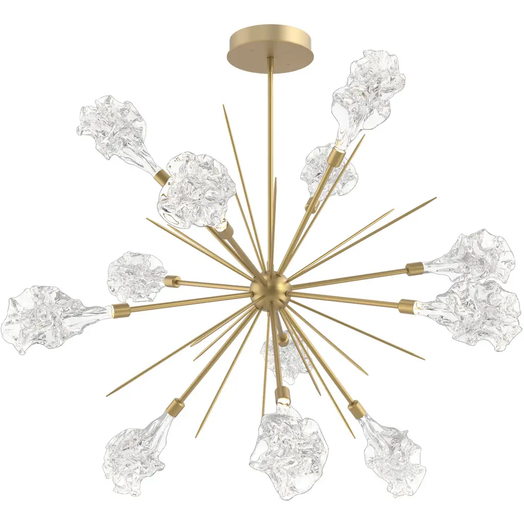Bursting with energy, the Blossom Starburst LED Chandelier from Hammerton Studio presents a stunning display of blown glass arranged in a dazzling display. An unassuming ceiling mount extends a thin and smooth downrod that ends with a shining, central core. Sharply emerging from this sphere is a series of metal rods, each capped with clear blown glass formed in unique, abstract patterns. The energy-efficient LED resting within each intricate shade diffuses a clean, warm glow that elevates your favorite space.