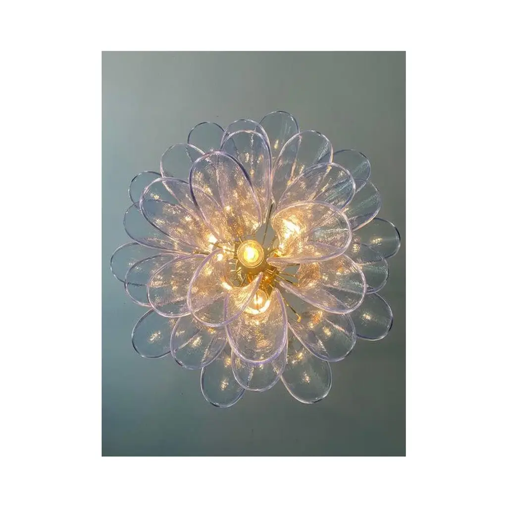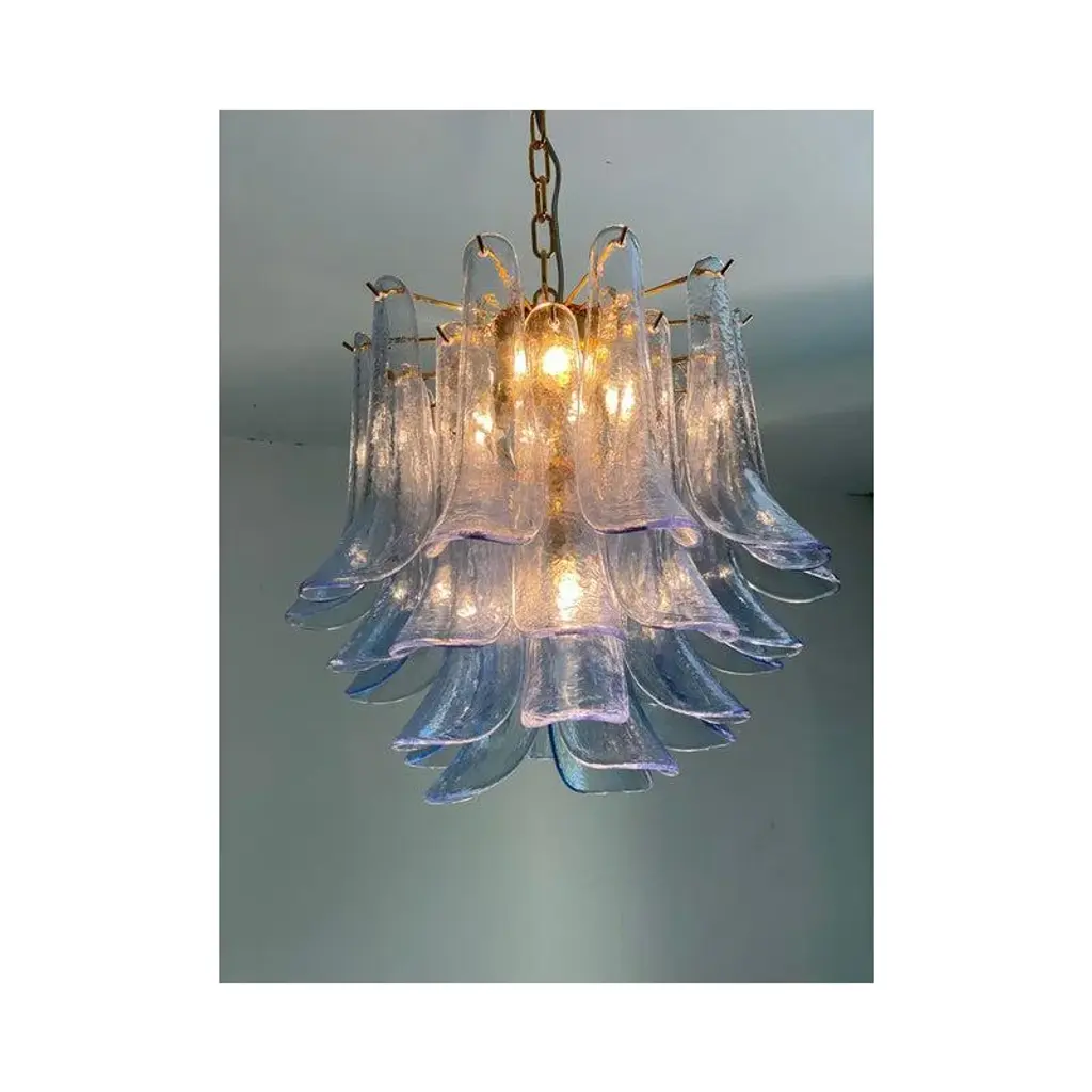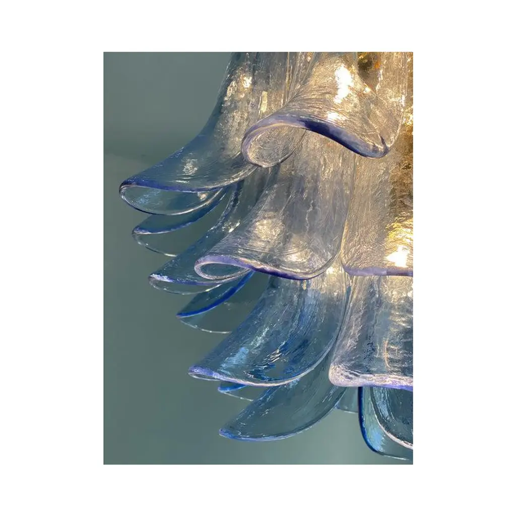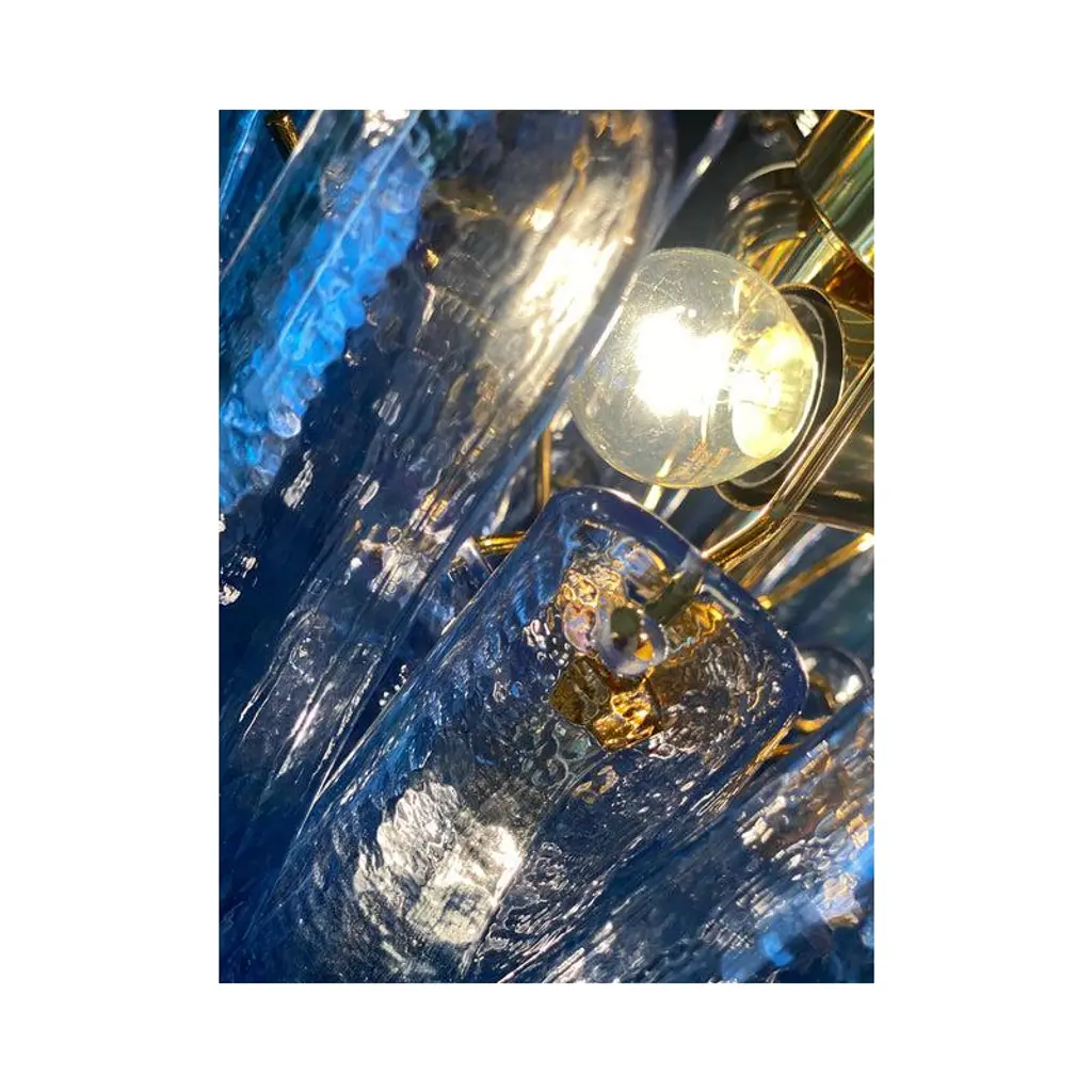 Contemporary and vintage mazzega style chandelier. blue transparent “selle” elements in murano glass, glass elements poured over a mold from traditional murano technique. murano glass decorated in blue made it vintage-modern style for luxury interiors. contemporary and vintage mazzega style chandelier. chain 50 cm = 19.7″ more canopy size (cm/in): d 50cm h 45cm /d 19.7″ h 17.7″ finishing: gold 24k plating bath metal frame. european plug (up to 250v).