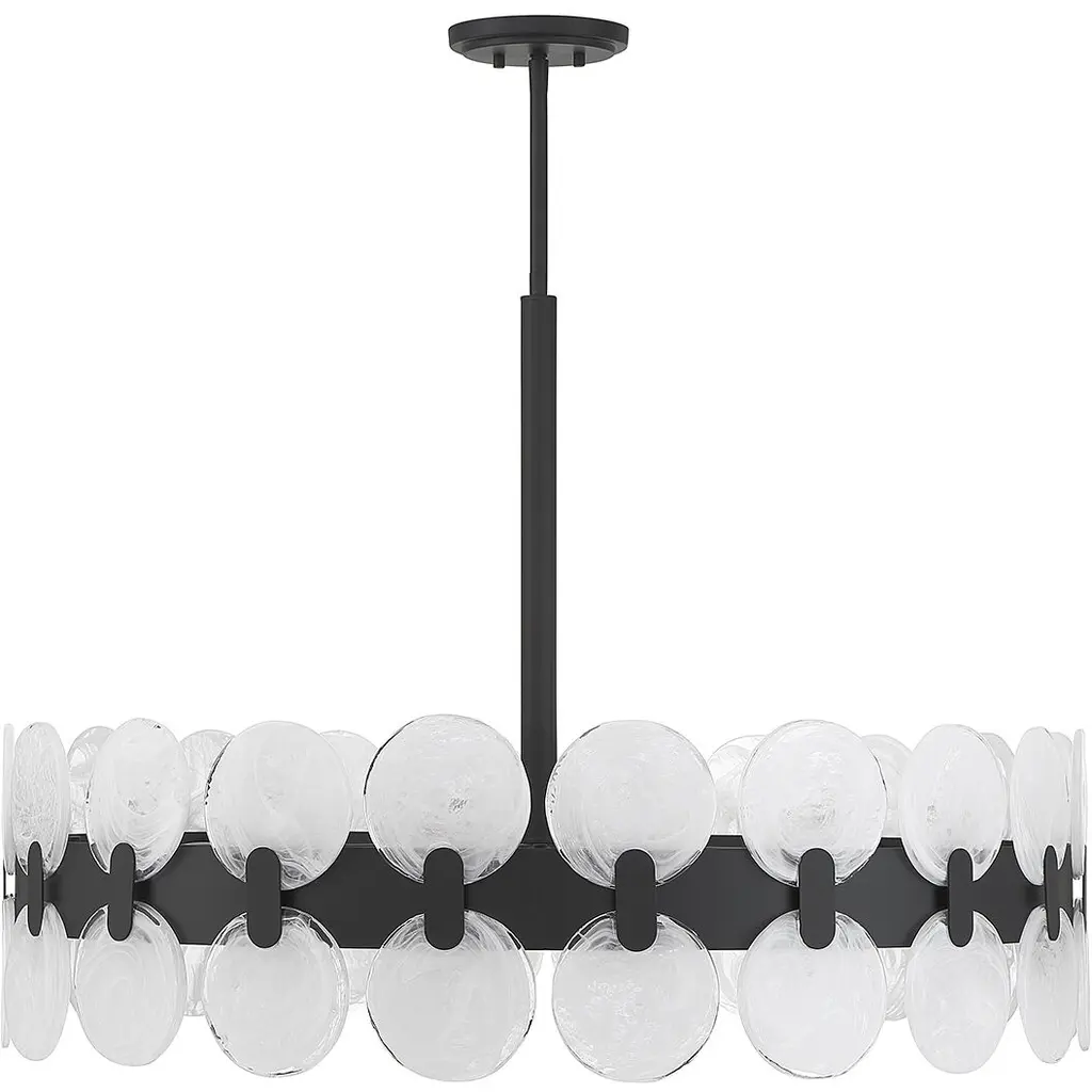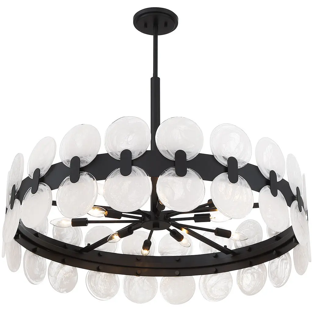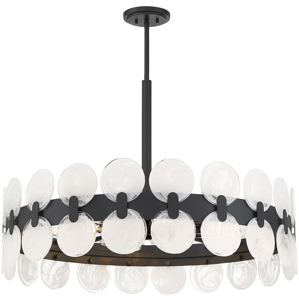 The Savoy House Boca 10-light chandelier skillfully combines a curving frame with soft organic touches to create a light that is truly the best of both worlds. The open structure is adorned with disks of strie piastra glass that feature mesmerizing swirling patterns. The beautiful wisps of white in the glass pair up perfectly with the fixture's matte black finish. Boca is 35.5" in width and has an adjustable height ranging from 25.5" to 79". Comes with four 12" downrods and one 6" downrod. Uses 10 candelabra size bulbs of up to 60 watts per bulb (bulbs not included).